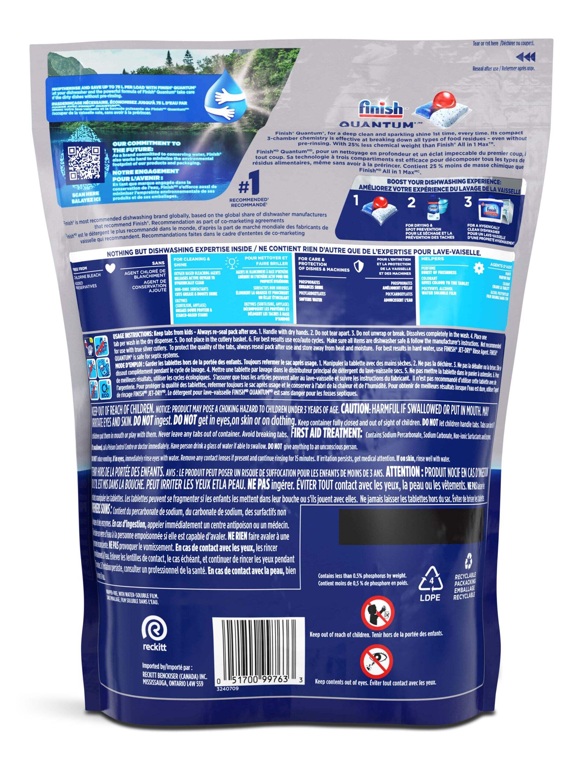 Tablettes FinishMD QuantumMD pour éliminer les taches graisseuses, tenaces et les aliments séchés au premier lavageMC. Tablette lave-vaisselle Quantum contenant 19 fois plus de puissance, y compris une action de pré-trempage et une action de protection pour le verre. Action de prétrempage qui absorbe et ramollit aussi les résidus alimentaires pour éviter le prérinçage.