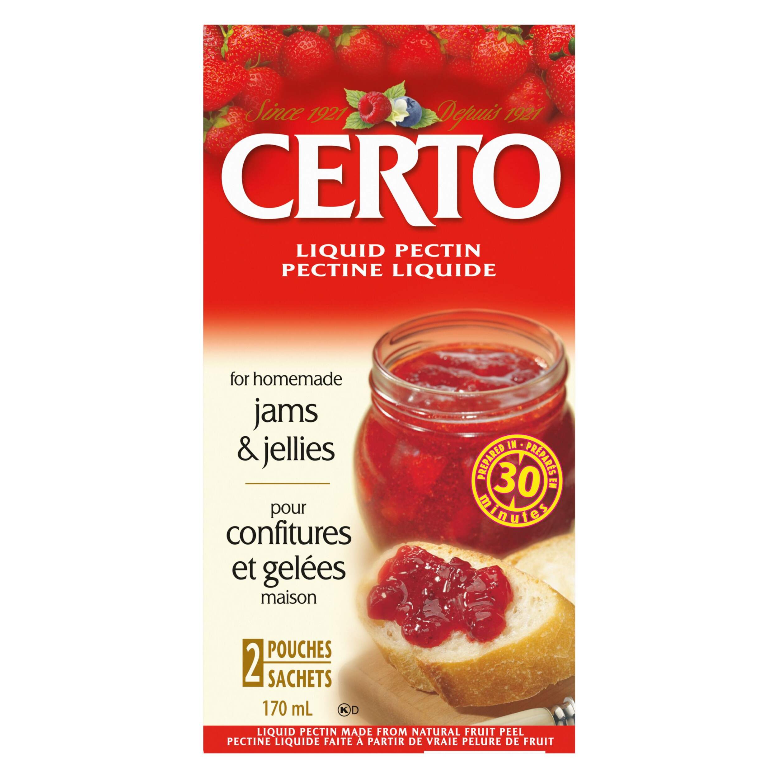 Pectine liquide Certo pouvant servir à préparer rapidement et facilement des confitures et des gelées cuites ou des confitures et gelées à congeler