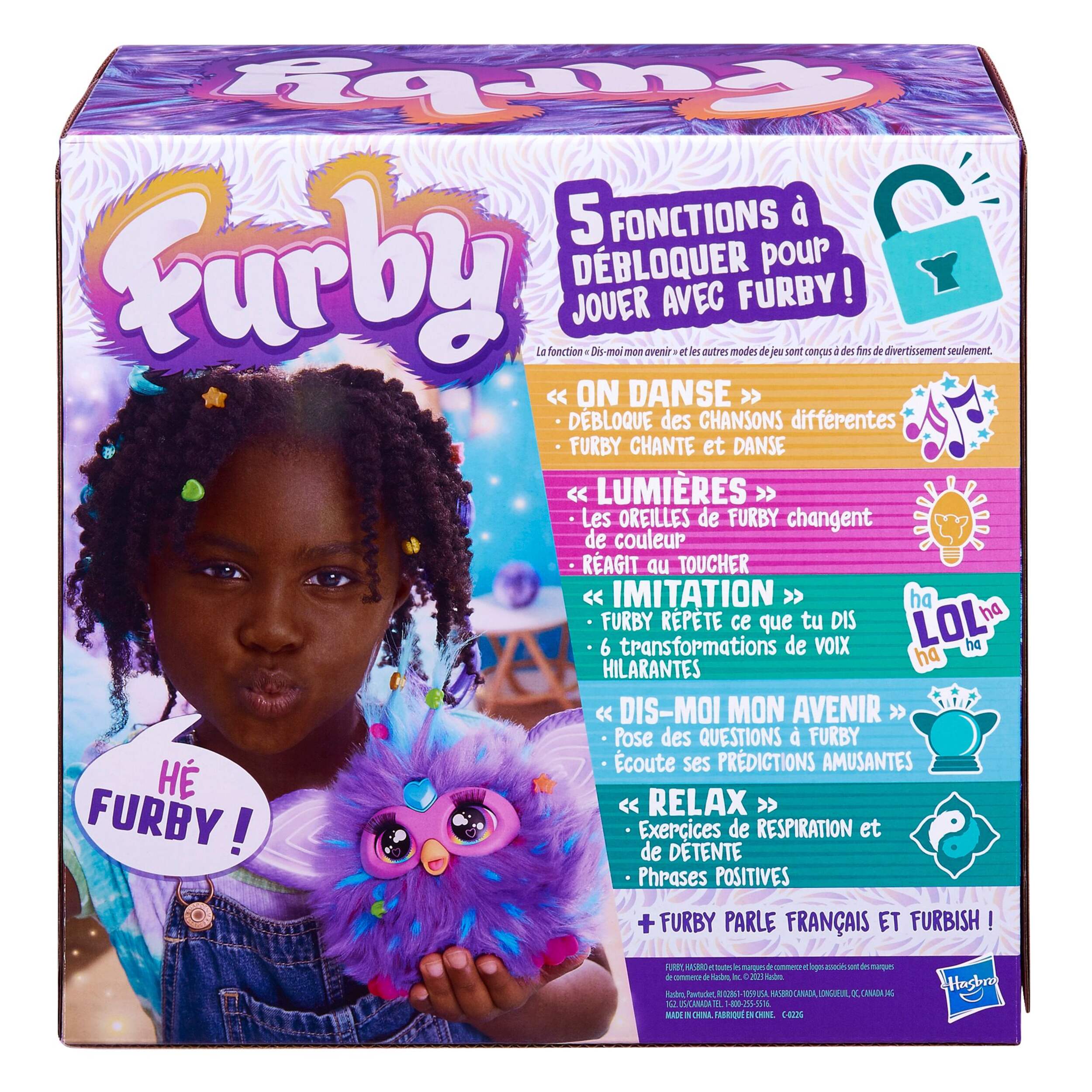 Cette petite créature curieuse est un jouet incroyablement interactif avec 5 modes activés par la voix et plus de 600 phrases, blagues, chansons et bien plus encore à découvrir. Dites à Furby ce que vous voulez faire avec ces 5 commandes : On danse, Imitation, Dis-moi mon avenir, Relax et Lumières. Furby réagit aussi aux câlins, aux tapotements sur la tête, à être secoué et à se faire nourrir sa fausse breloque de pizza (ou votre doigt, miam). Plus ils jouent, plus ils débloquent du plaisir! Prenez soin de Furby en le nourrissant et en peignant ses cheveux. Habillez-le avec les perles à pince et créez des accessoires mode que les enfants peuvent aussi porter. Ce jouet électronique en peluche est un cadeau idéal pour les enfants de 6 ans et plus et un compagnon amusant à avoir à leurs côtés.