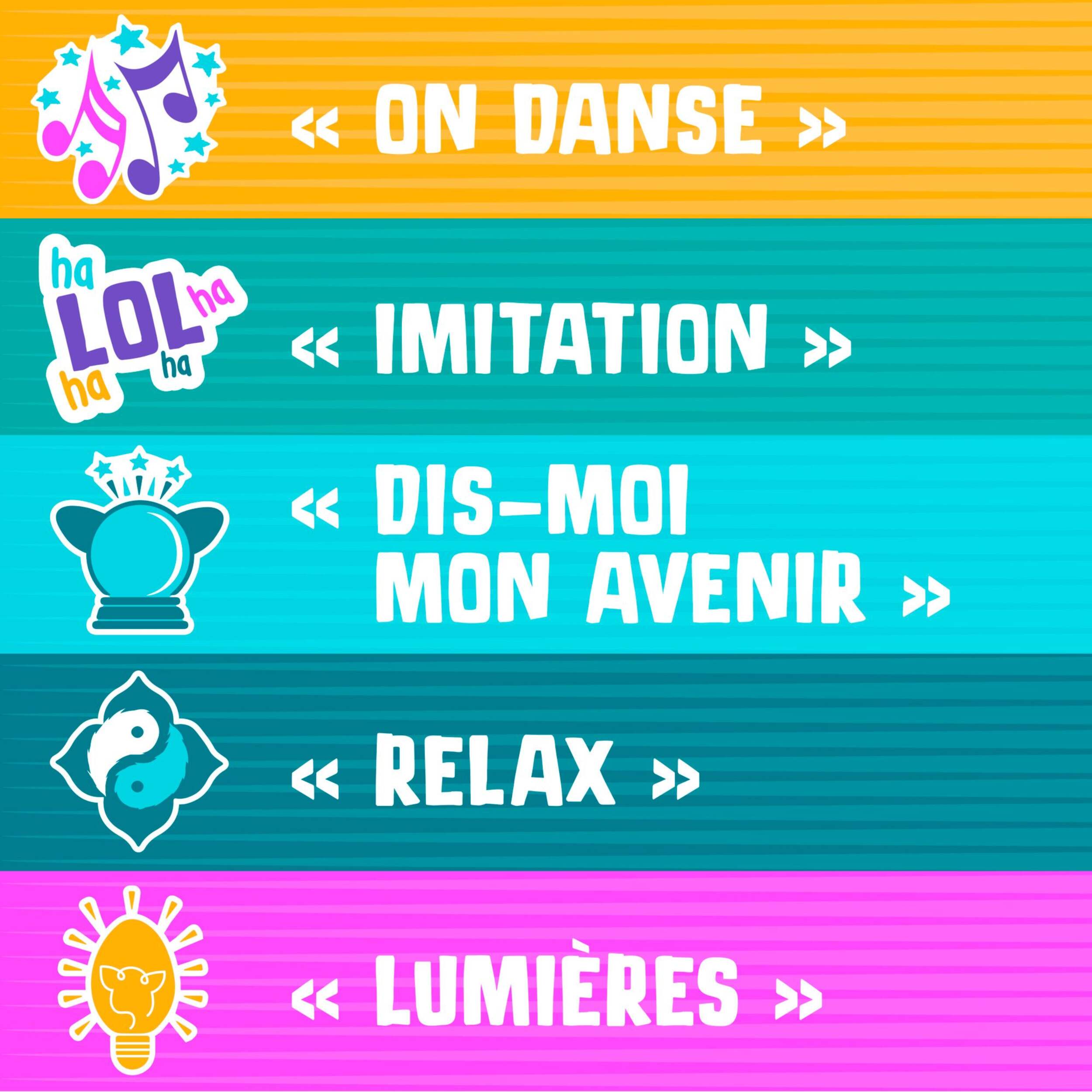 Dites à Furby ce que vous voulez faire avec ces 5 commandes : On danse, Imitation, Dis-moi mon avenir, Relax et Lumières