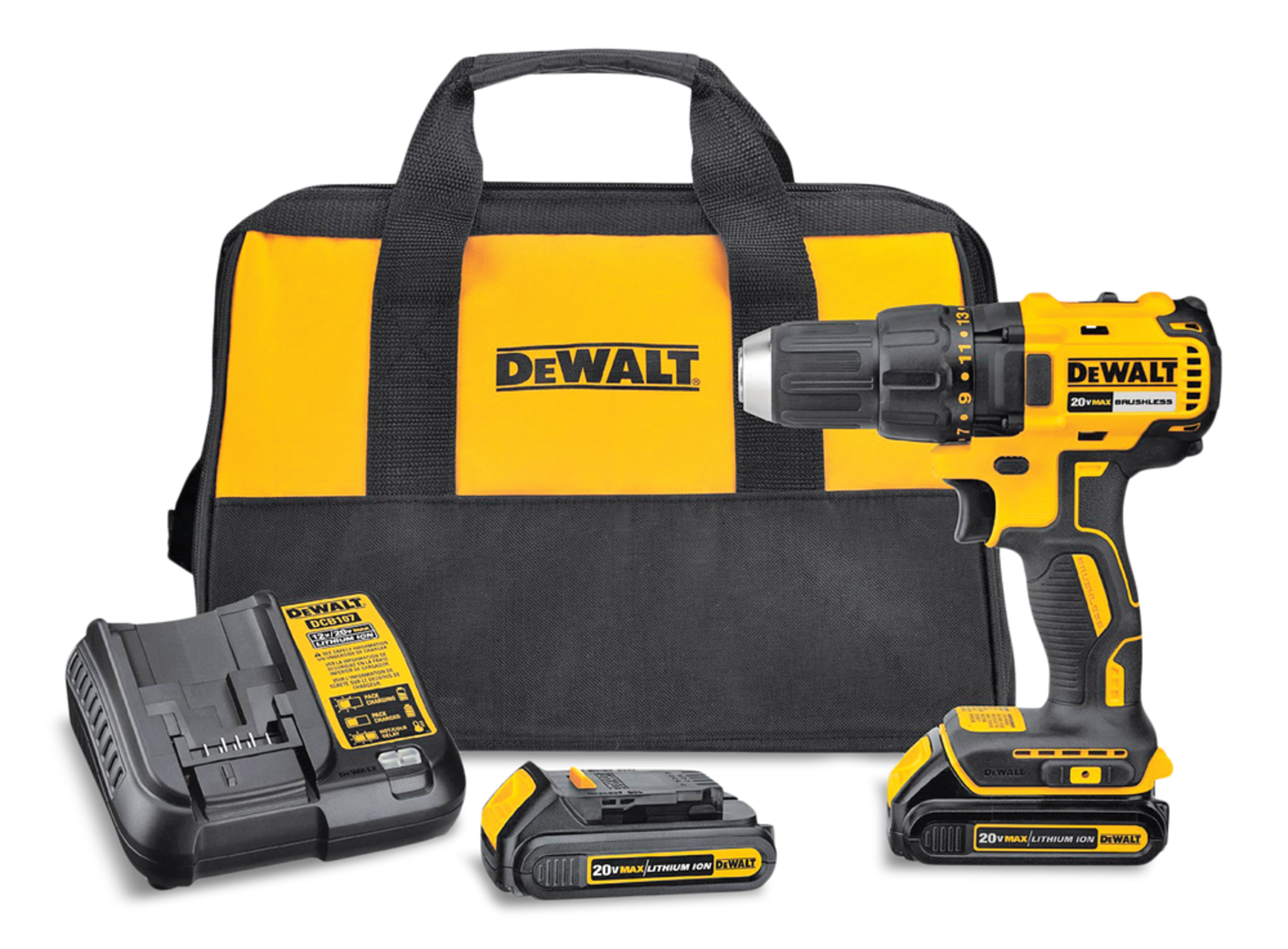 Comprend : (1) perceuse sans balais DCD777 de 1/2 po, (2) piles DCB201 de 1,5 Ampère-heure, un chargeur et un étui souple