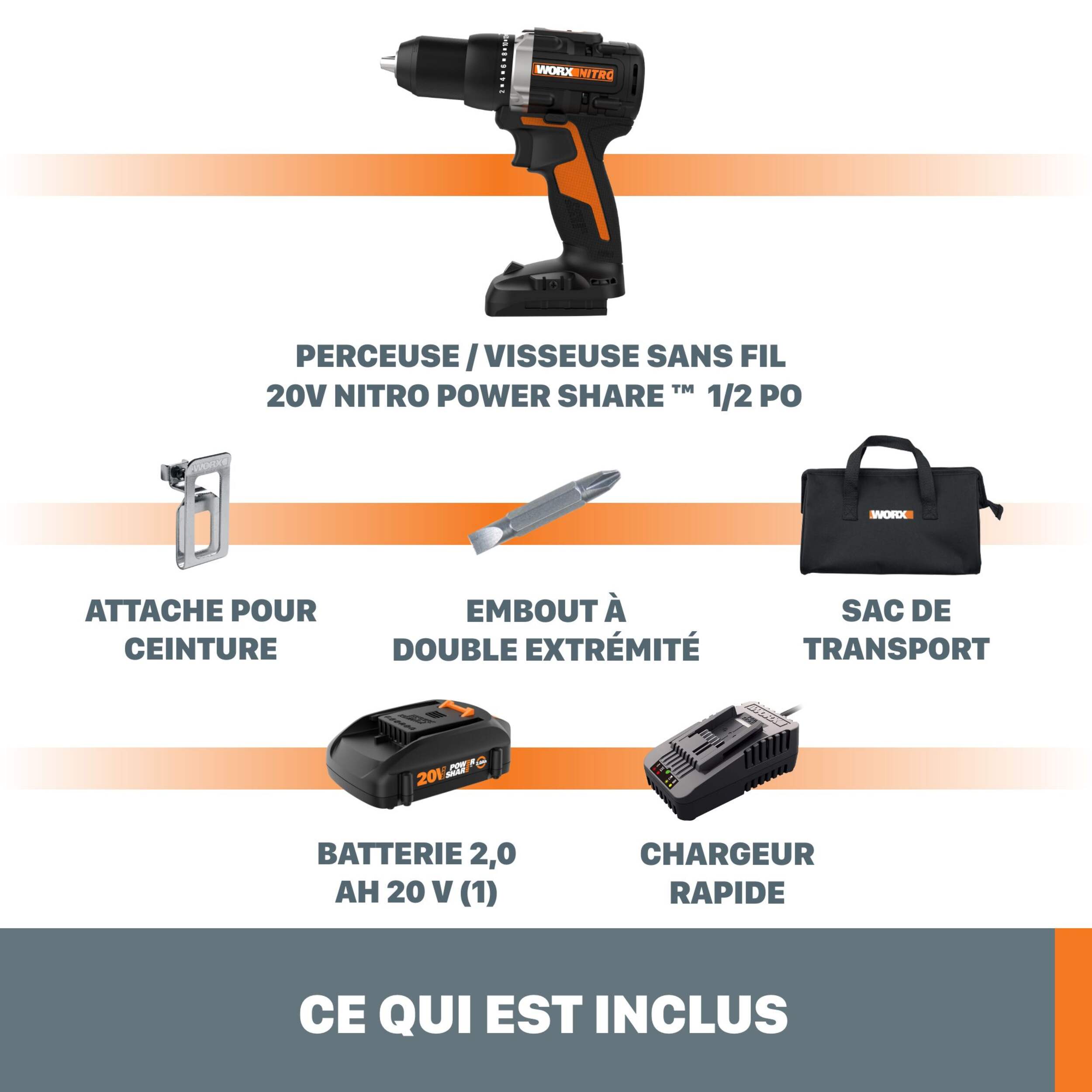 Perceuse-tournevis sans balai WORX NITRO, 20 V, offrant une autonomie 50 % plus longue et 25 % plus de puissance qu'une perceuse-tournevis classique