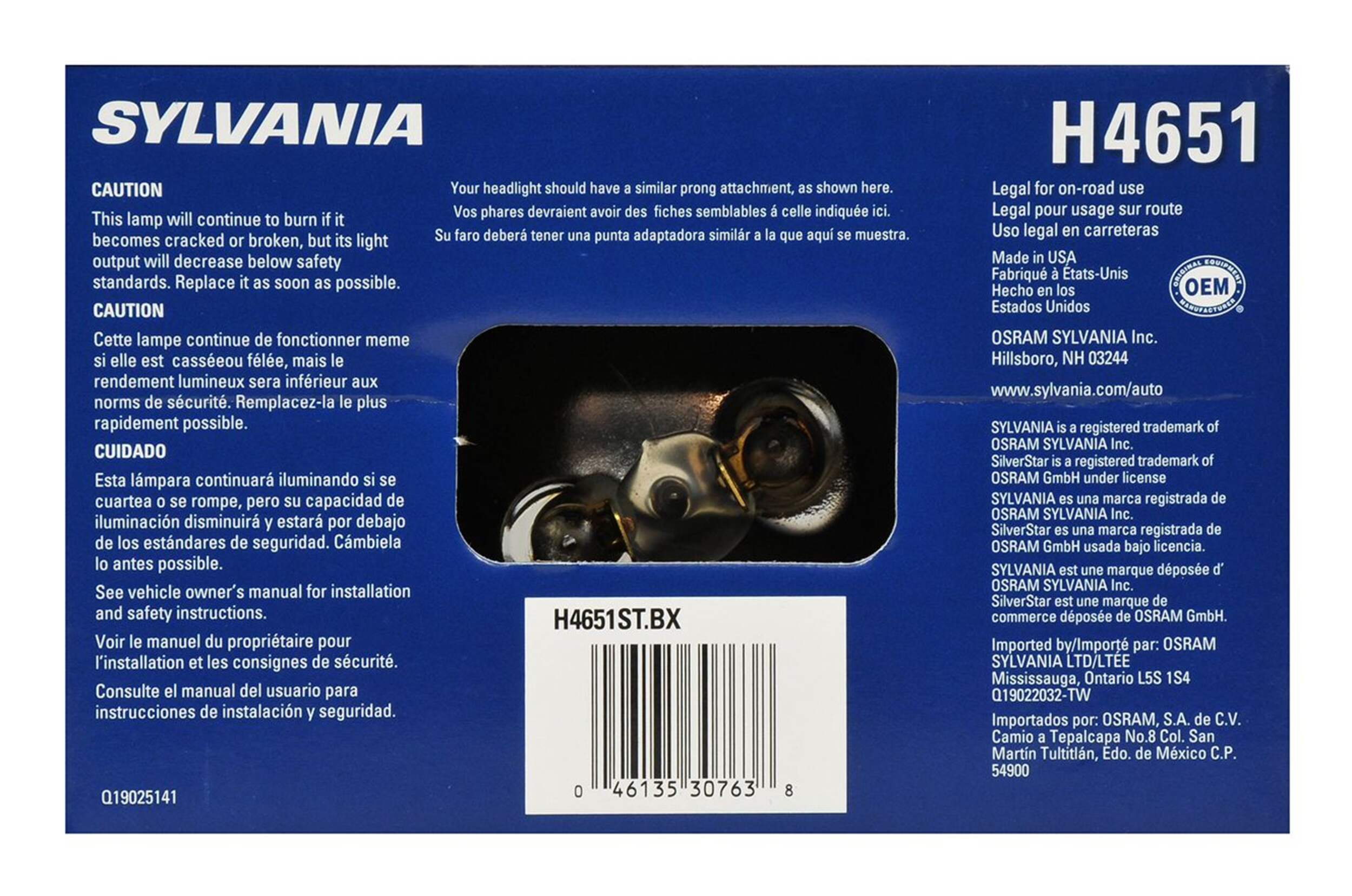 Ampoules de phare scellé haute performance H4651 SYLVANIA Silverstar MD offrant un équilibre amélioré de visibilité et de durée de vie des ampoules pour offrir une lumière plus brillante et plus blanche que celle des ampoules SYLVANIA de base. Combinaison d'une meilleure visibilité de la route et des côtés et d'une lumière plus blanche qui aide à obtenir plus de clarté pendant la conduite nocturne. Plus grande clarté qui peut améliorer le contraste et la visibilité des objets, comme les panneaux routiers et les dangers sur la route.
