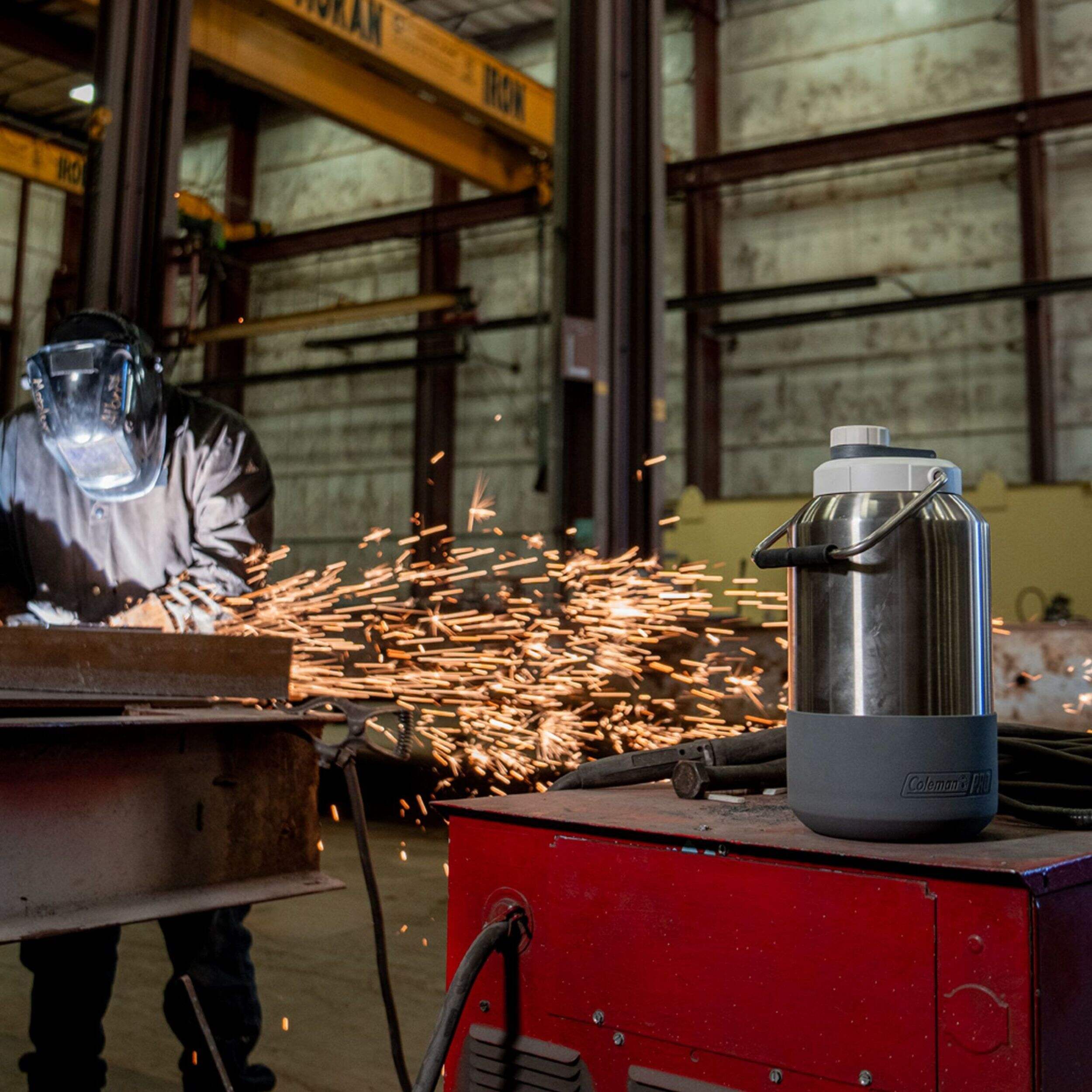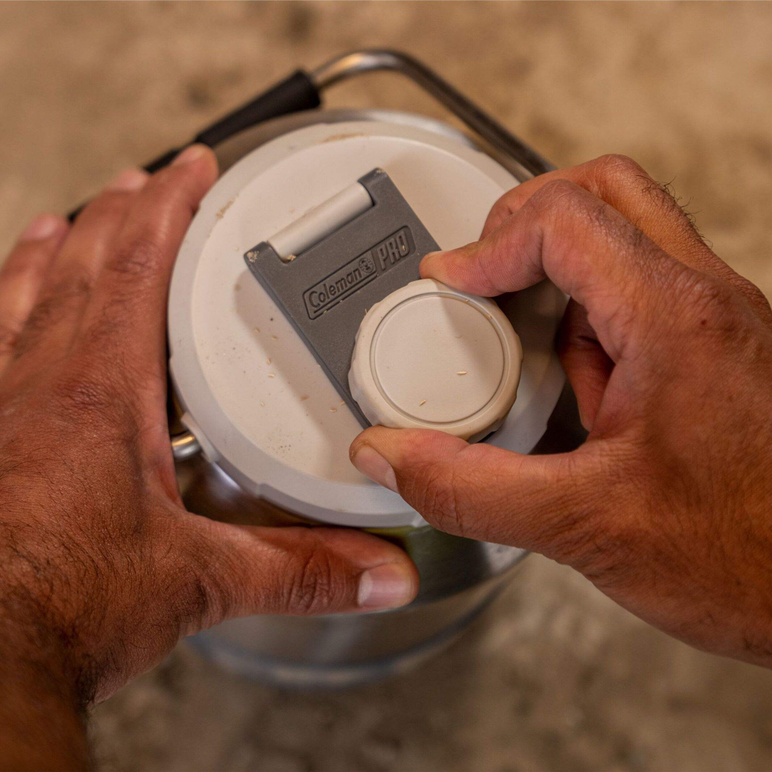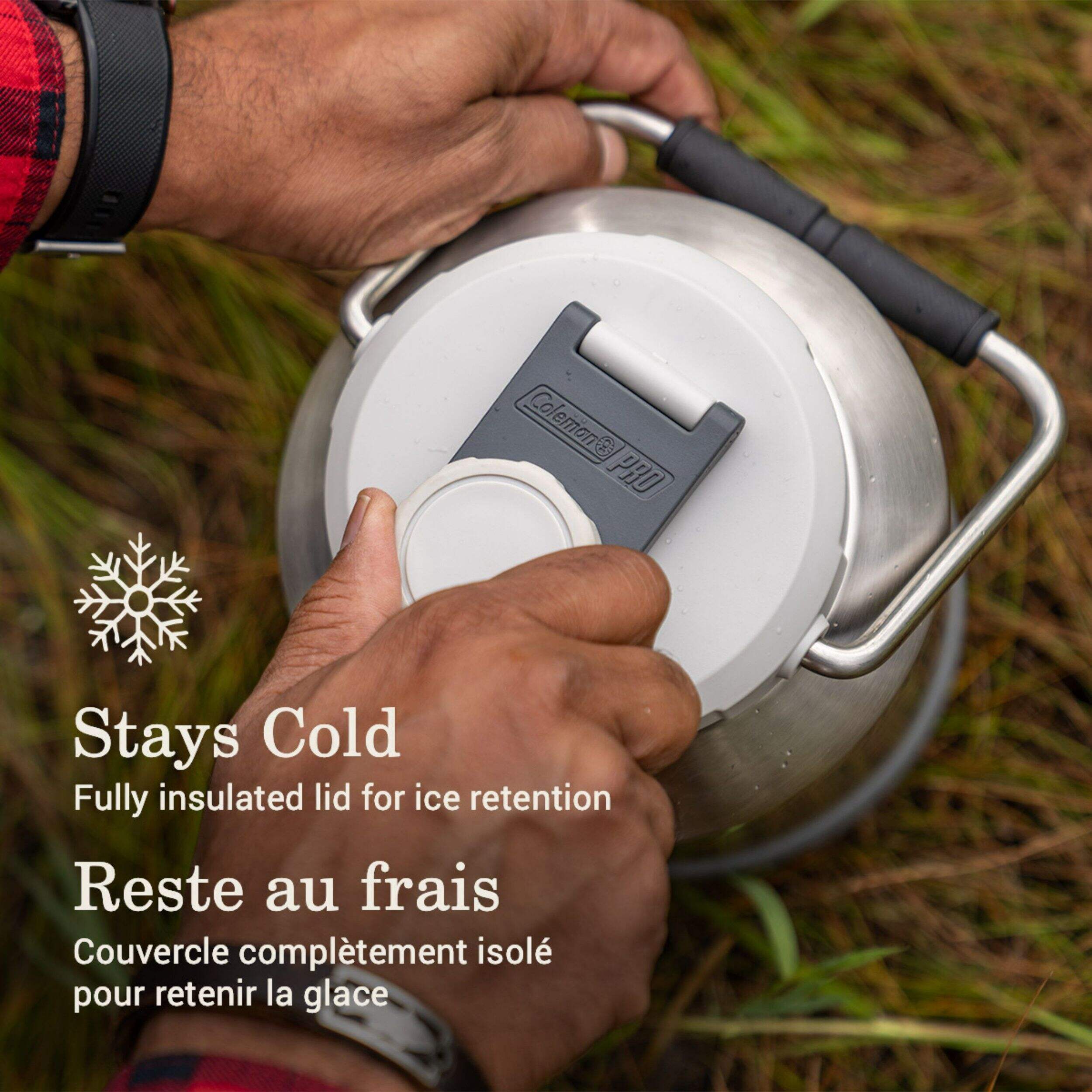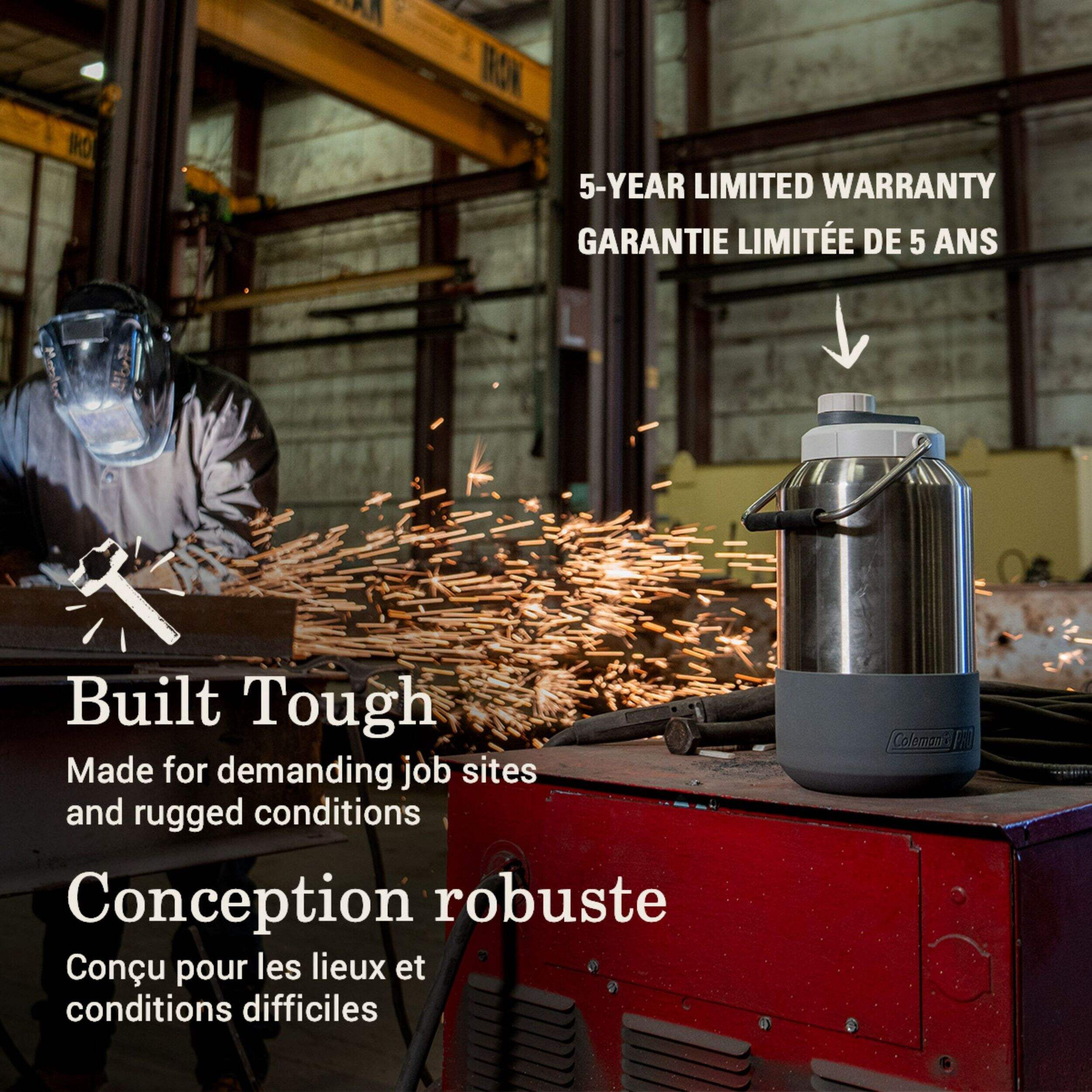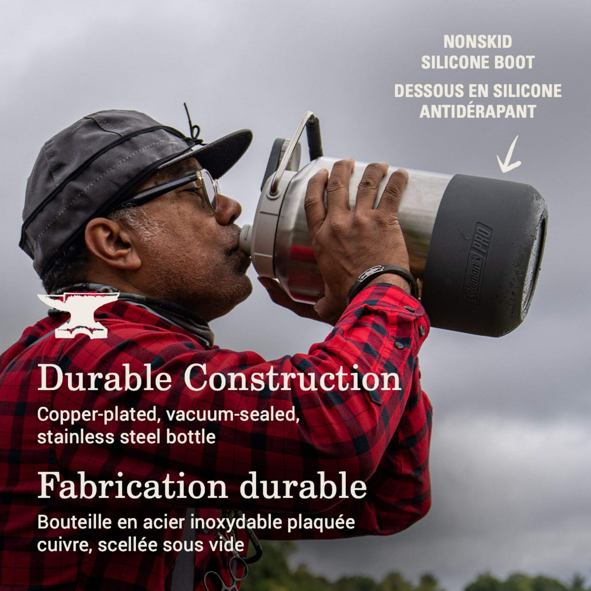 Coleman Pro : de l'équipement qui travaille aussi fort que vous. Il est spécialement conçu pour une utilisation quotidienne dans les environnements les plus exigeants. Le pichet à eau Coleman Pro de 3,7 L (1 gallon) est fait d'acier inoxydable plaqué de cuivre durable et est surmonté d'un couvercle entièrement isolé pour garder l'eau froide, même au soleil. Couvert par une garantie limitée de 5 ans, ce grand pichet d'eau est conçu avec des accessoires intelligents comme un bouchon étanche attaché facile à manipuler avec des gants de travail et ne s'égarera pas même si vous le laissez tomber. Le dessous en silicone de la bouteille d'eau Coleman l'aide à rester en place lorsque vous la déposez, puis se retire pour un nettoyage facile au lave-vaisselle. Une poignée surdimensionnée rend le transport confortable lorsque la bouteille est remplie jusqu'au bord.