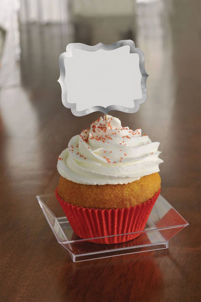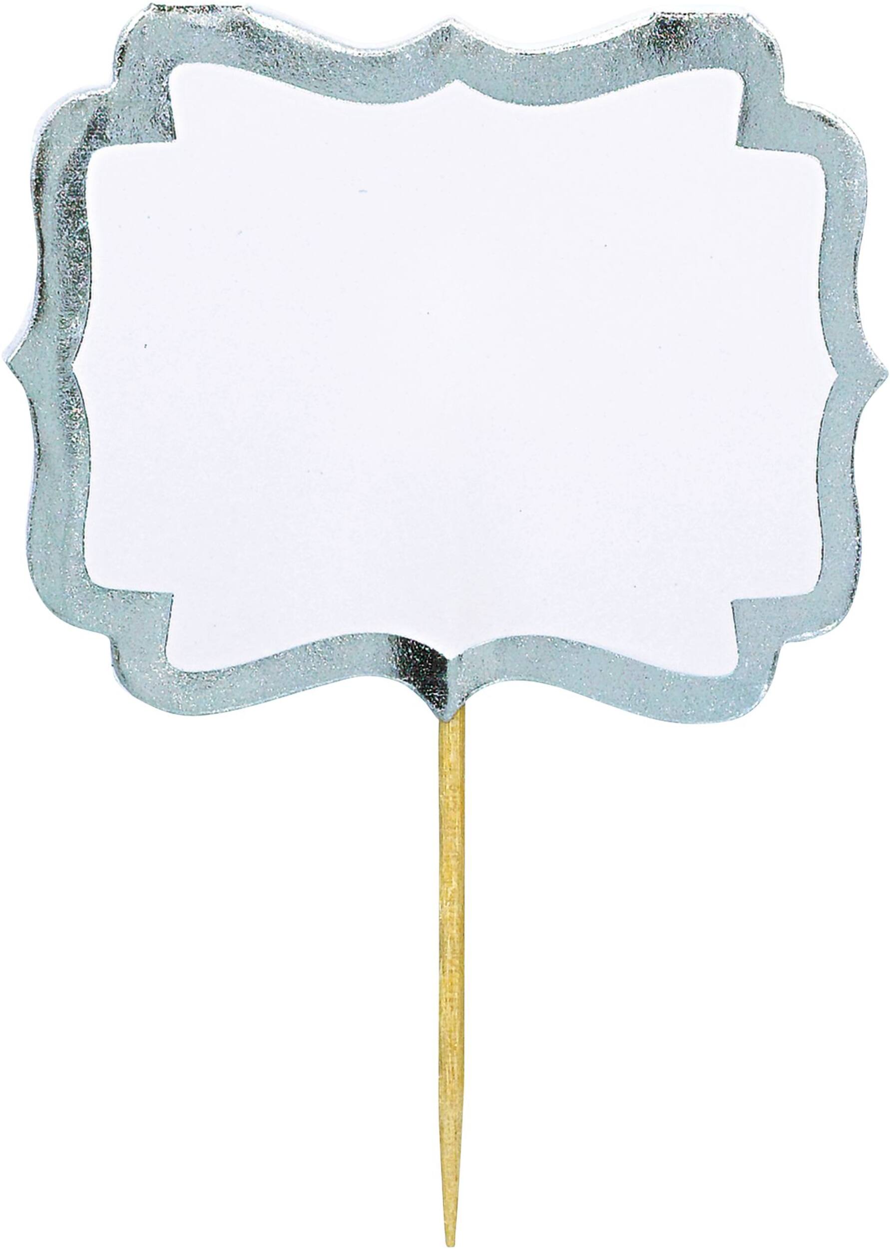 Étiquettes sur cure-dents blanches en forme de parchemin avec une bordure argentée métallique