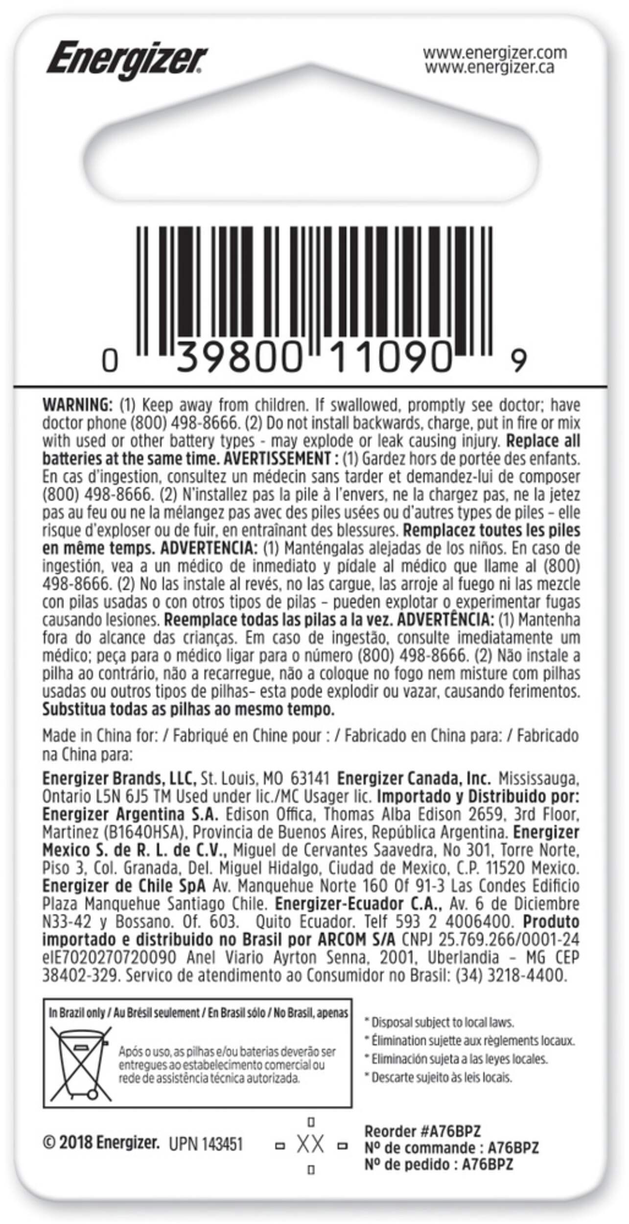 Les piles Energizer A76 fournissent une alimentation fiable pour vos gadgets importants. Ces mini-piles sont compatibles avec une variété d'appareils, y compris votre système d'entrée sans clé, vos moniteurs de fréquence cardiaque et vos glucomètres. Utilisez ces petites piles lorsque vous avez besoin de piles de rechange pour calculatrice ou de nouvelles piles pour les montres, les jouets ou les jeux. Comme les piles à oxyde d'argent, ces piles boutons alcalines miniatures ne contiennent aucun mercure pour réduire l'impact sur l'environnement. Comptez sur Energizer, la marque numéro un de piles spécialisées, pour offrir la puissance fiable dont vous avez besoin pour vos appareils.