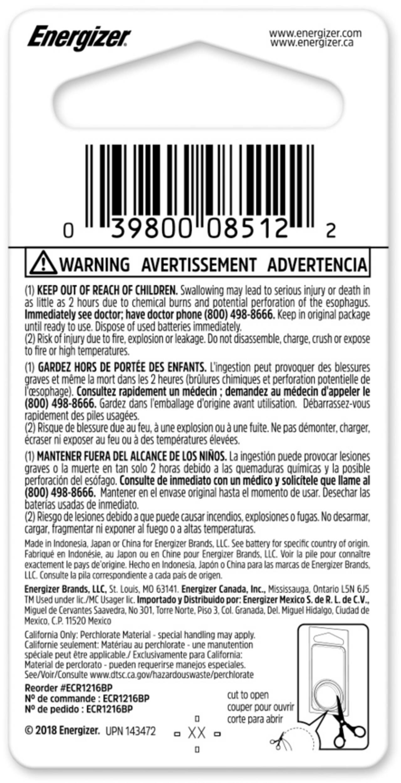 Ne laissez pas sa petite taille vous surprendre : Cette pile bouton au lithium de 3 V 1216 d'Energizer offre une alimentation fiable et durable pour vos articles fonctionnant à piles. Qu'il s'agisse de moniteurs de fréquence cardiaque ou de glycémie, de télécommandes, de systèmes d'entrée sans clé, de porte-clés, de montres, de jouets, jeux ou gadgets spécialisés, nos piles boutons sont compatibles avec les appareils de votre vie pour que vous puissiez continuer de les utiliser. Ces piles boutons au lithium d'Energizer sont fiables et durables, pouvant résister à une vaste plage de températures (de 22 à 140 °F) et conserver leur charge pendant huit ans d'entreposage, ce qui vous donne une autonomie de pile bouton fiable. Conçues de façon responsable sans mercure, il est facile de comprendre pourquoi les piles boutons au lithium d'Energizer sont le bon choix pour vos appareils spécialisés.