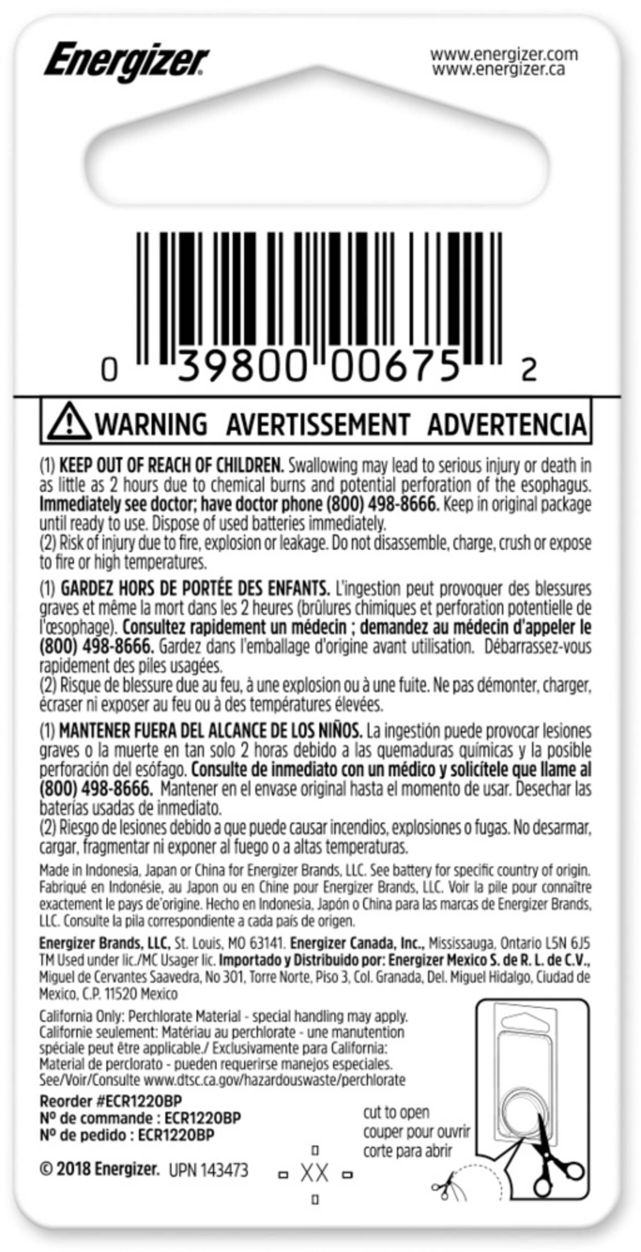 Ne laissez pas sa petite taille vous surprendre : Cette pile bouton au lithium de 3 V 1220 d'Energizer offre une alimentation fiable et durable pour vos articles fonctionnant à piles. Qu'il s'agisse de moniteurs de fréquence cardiaque ou de glycémie, de télécommandes, de systèmes d'entrée sans clé, de porte-clés, de montres, de jouets, jeux ou gadgets spécialisés, nos piles boutons sont compatibles avec les appareils de votre vie pour que vous puissiez continuer de les utiliser. Ces piles boutons au lithium d'Energizer sont fiables et durables, pouvant résister à une vaste plage de températures (de 22 à 140 °F) et conserver leur charge pendant huit ans d'entreposage, ce qui vous donne une autonomie de pile bouton fiable. Conçues de façon responsable sans mercure, il est facile de comprendre pourquoi les piles boutons au lithium d'Energizer sont le bon choix pour vos appareils spécialisés.