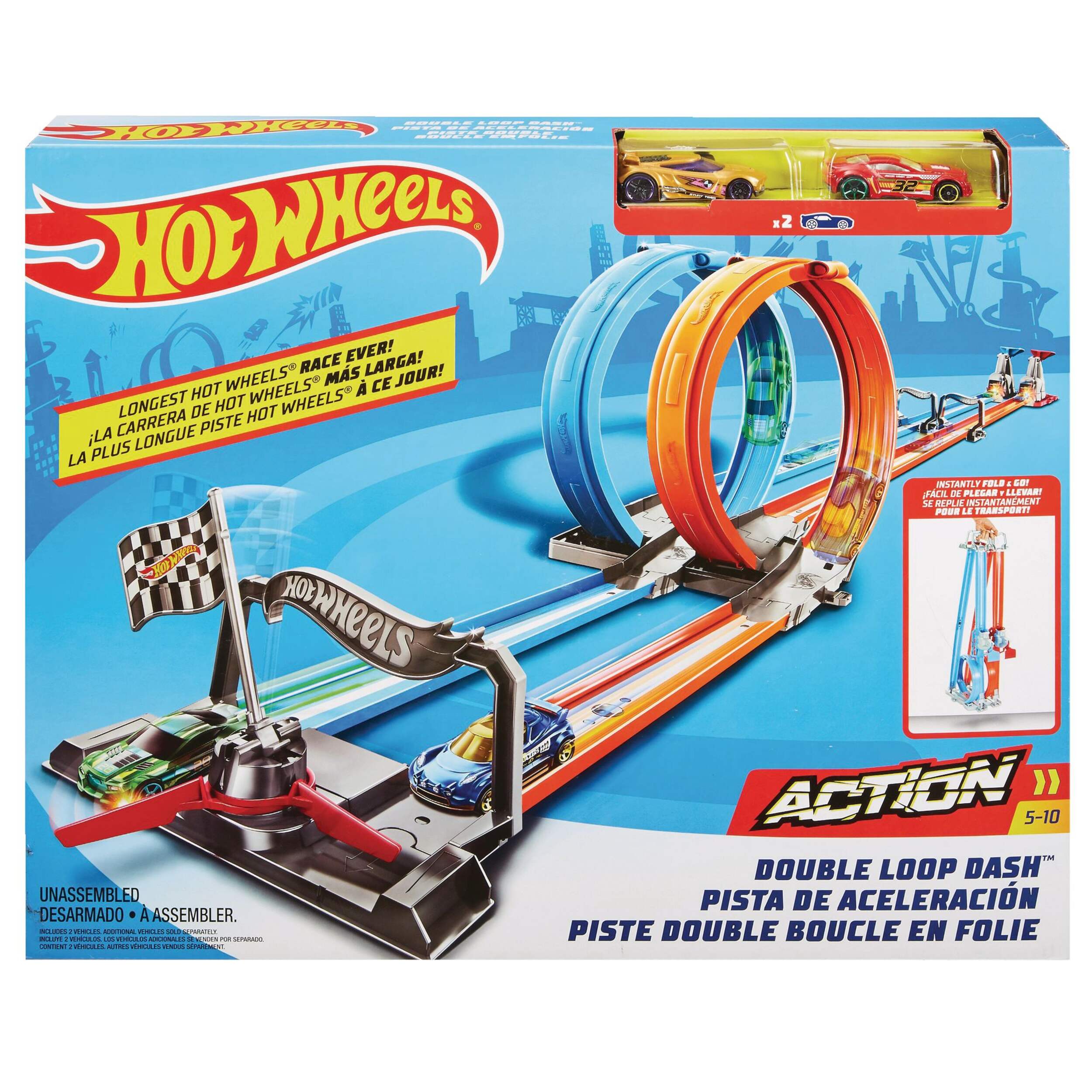 Préparez-vous à faire la course avec cet ensemble de piste double boucle en folie Hot WheelsMD DashMC. Doté de la plus longue course d'accélération côte à côte, cet ensemble de piste permet aux enfants de faire la course sur la piste et dans la boucle pour être le premier à atteindre la barrière d'arrivée et activer le drapeau victorieux. Cette piste comprend aussi une boucle double classique pour une action dynamique. Polyvalent et amusant, ce circuit de course est un cadeau idéal pour les anniversaires, Noël et plus encore.