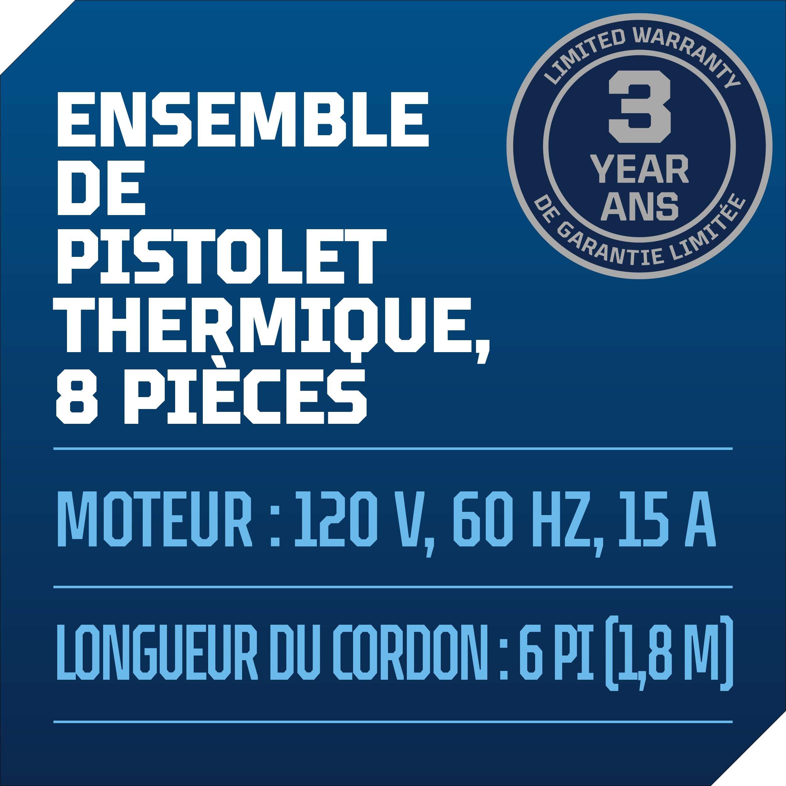 L'ensemble comprend : pistolet thermique à cordon, 3 lames de grattoir, grattoir, buse de protection en verre, buse plate, buse à crochet, buse concentrée et boîtier moulé par soufflage