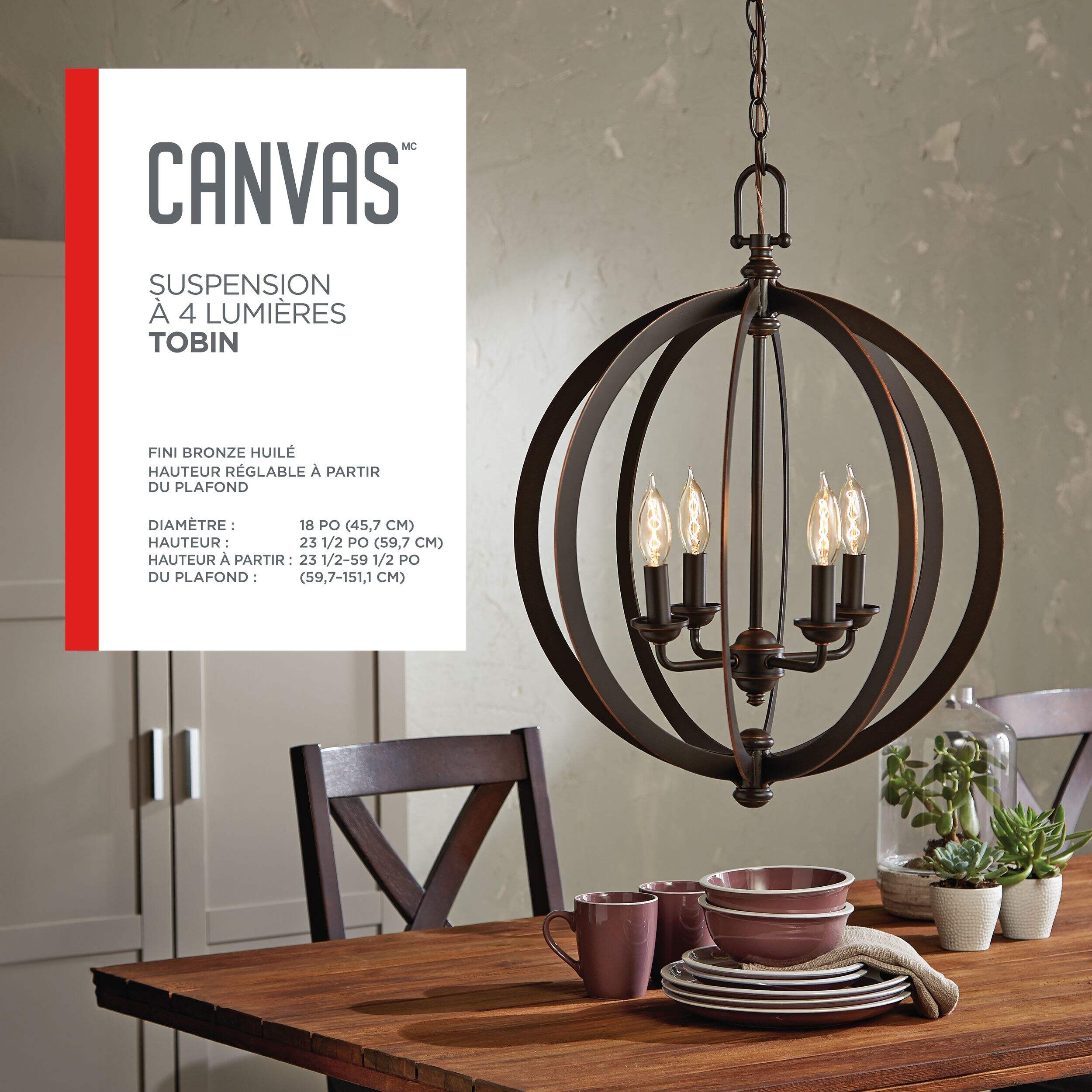 Le plafonnier suspendu à 4 lampes CANVAS Tobin ajoute une touche raffinée à n'importe quelle pièce. Ce luminaire suspendu crée une atmosphère chaleureuse et accueillante, idéale pour les salles à manger, les cuisines ou les entrées, et il offre amplement d'éclairage pour les rassemblements ou une utilisation quotidienne. L'installation est simple avec la quincaillerie incluse et la hauteur réglable varie de 23,5 po à 59,5 po pour convenir aux besoins de votre pièce. Les ampoules sont vendues séparément et un installateur qualifié est recommandé pour des raisons de sécurité.