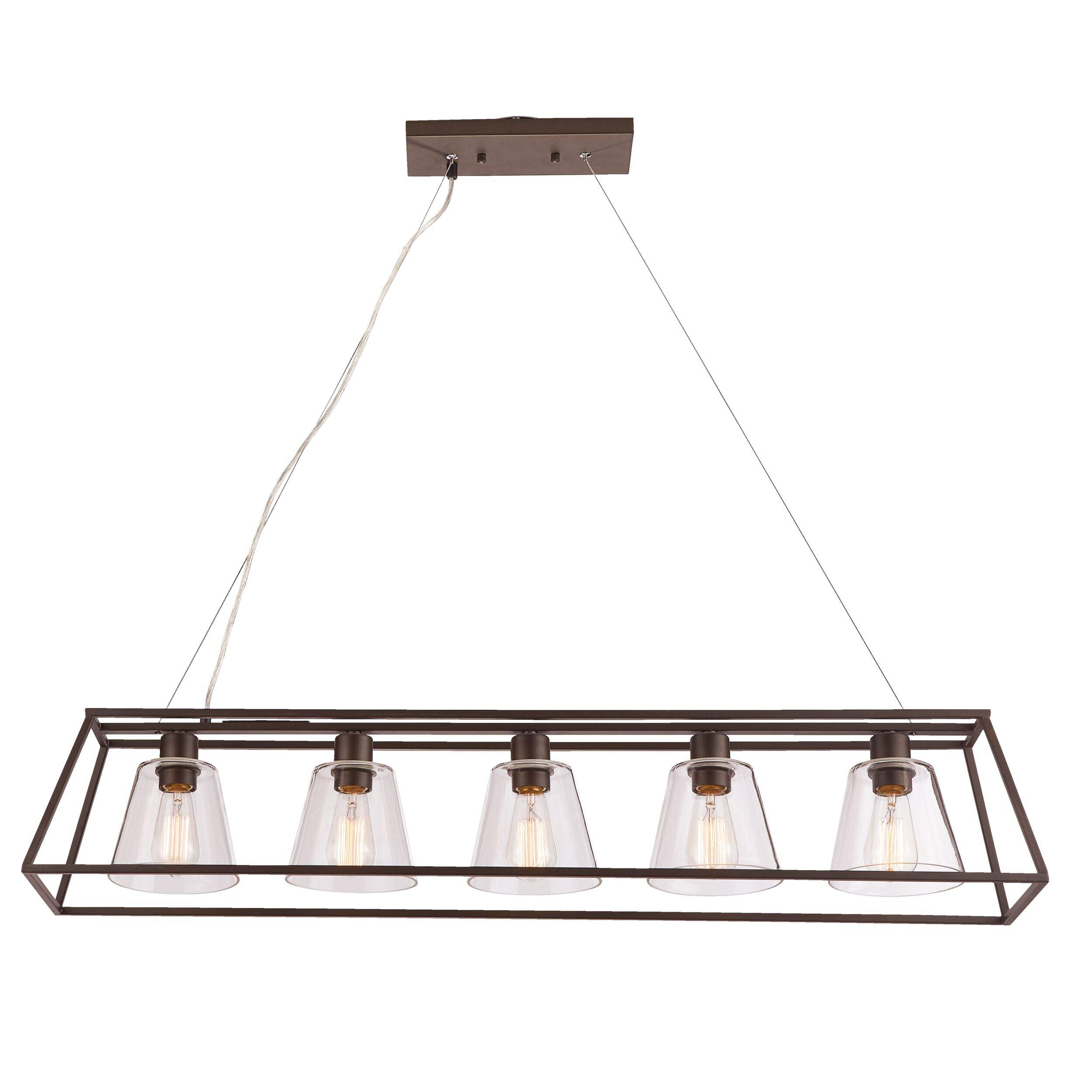 Ajoutez un style champêtre à n'importe quelle pièce de votre maison avec ce plafonnier suspendu CANVAS Sienna. Profitez des tons froids et élégants de ce plafonnier suspendu et de ses 5 lampes avec un fini en métal bronze et des abat-jour en verre transparent. Donnera une allure unique à n'importe quelle pièce, que vous profitiez d'un repas avec votre famille dans la cuisine ou la salle à manger, que vous vous rassembliez entre amis dans le salon ou la salle familiale, ou que vous ajoutiez une touche d'élégance à l'entrée de votre maison. Plafonnier suspendu nécessitant 5 ampoules de 60 W maximum ou équivalent, vendues séparément. Comprend tout le matériel de fixation et les instructions pour faciliter le processus d'installation autant que possible. Distance du plafond pouvant être ajustée de 9-13/16 à 51-3/16 po selon vos préférences et s'adapter à votre pièce selon vos besoins. Plafonnier qui doit être installé conformément au code sur l'installation par une personne habituée au montage et au fonctionnement de l'article ainsi qu'aux dangers y étant associés.