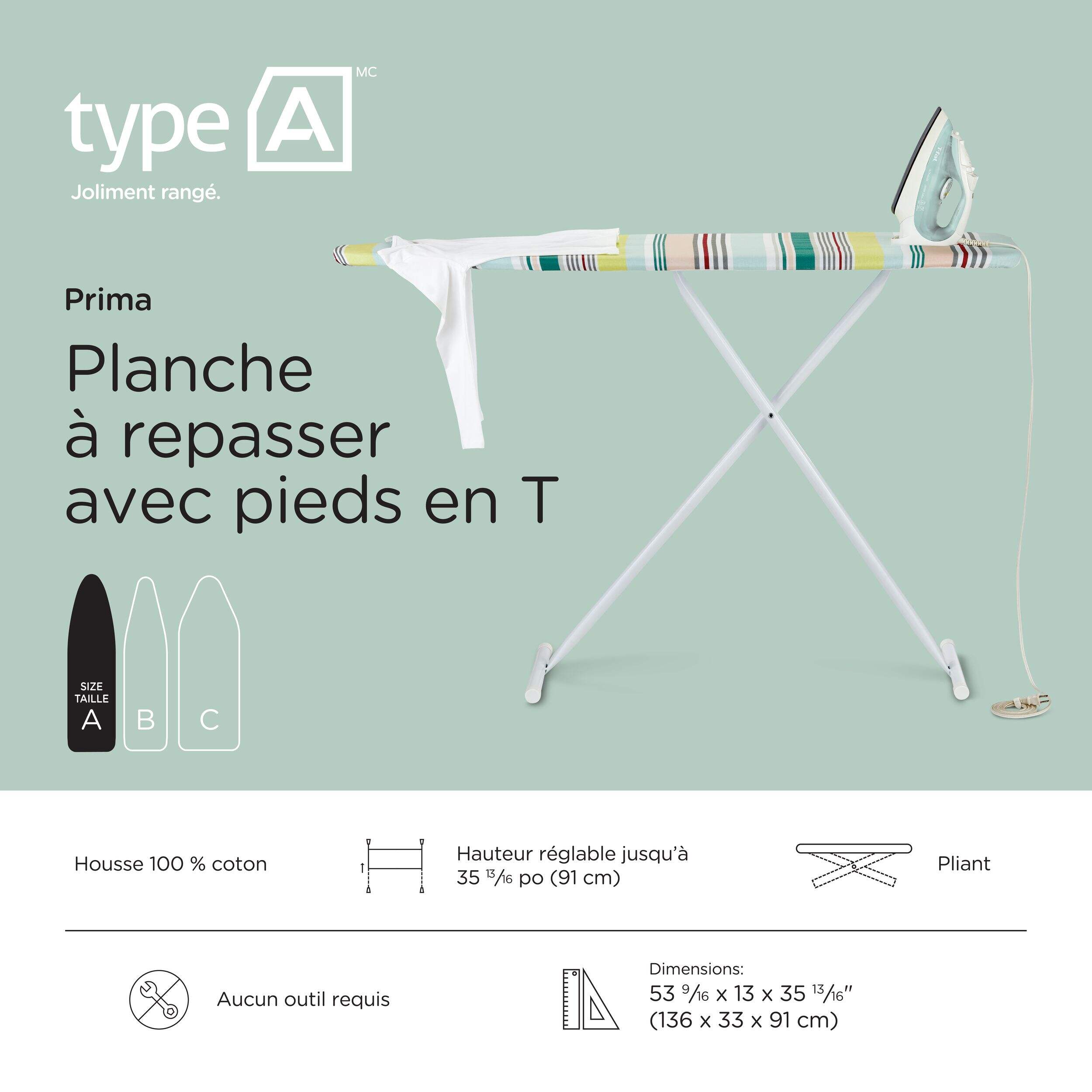 La planche à repasser avec pattes en T Type A offre une surface spacieuse pour repasser sans effort. Sa housse protège vos vêtements et l'imprimé attrayant lui donne un style élégant. Entièrement repliable, cette planche à repasser est facile à ranger derrière une porte ou dans un placard lorsque vous ne l'utilisez pas. Cette planche à repasser Type A peut être jumelée à d'autres articles de la collection Type A pour compléter votre installation.