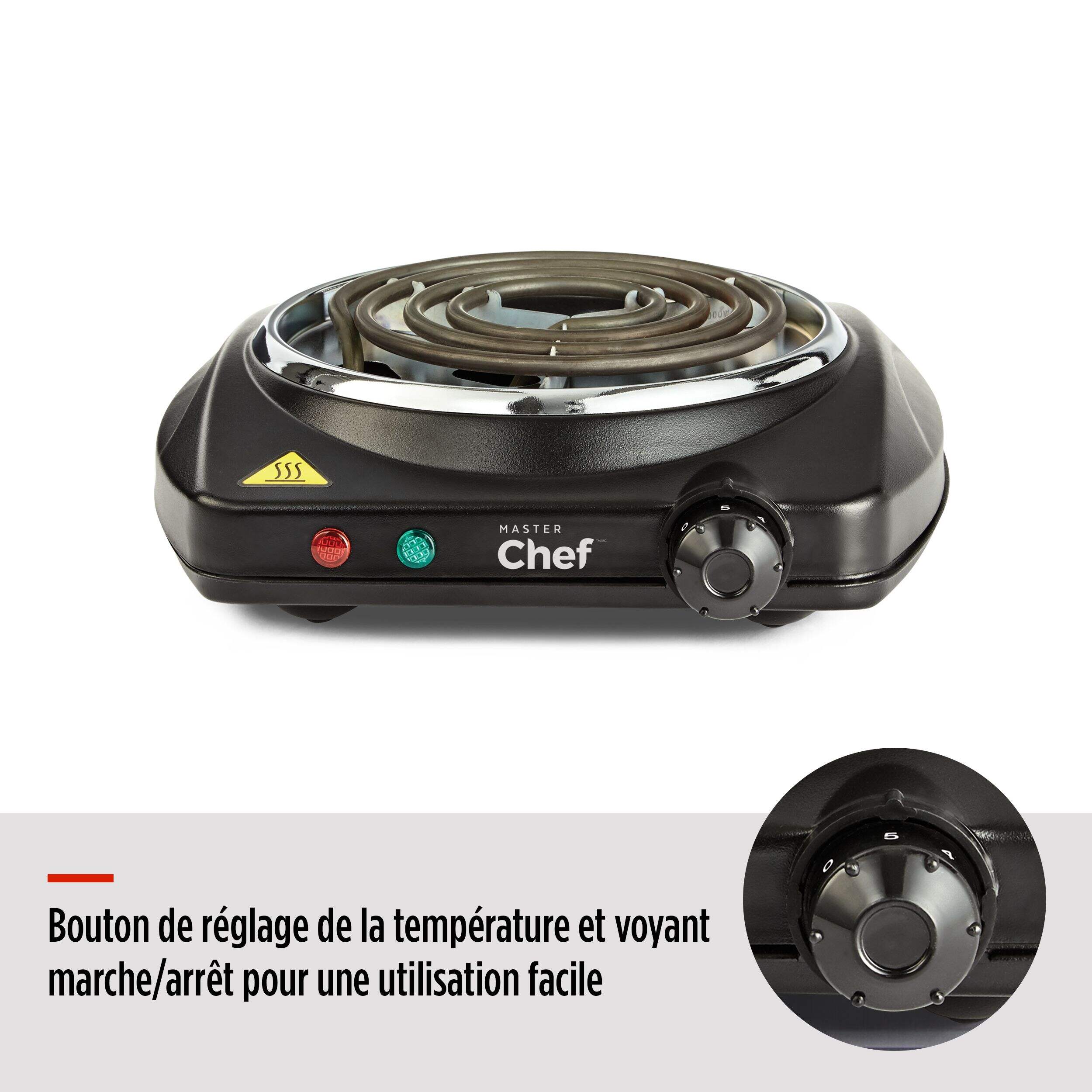 Plaque chauffante MASTER Chef à un brûleur qui peut être utilisée sur votre comptoir de cuisine lorsque vous avez besoin d'un brûleur supplémentaire. Plaque chauffante électrique également utile dans les chambres d'étudiant, au chalet ou dans tout autre endroit où l'espace dans la cuisine est limité. Facile à utiliser, le brûleur de la plaque chauffante est doté d'un voyant de fonctionnement vert et d'un bouton de contrôle de la température pour que vous puissiez cuire des plats à la perfection.