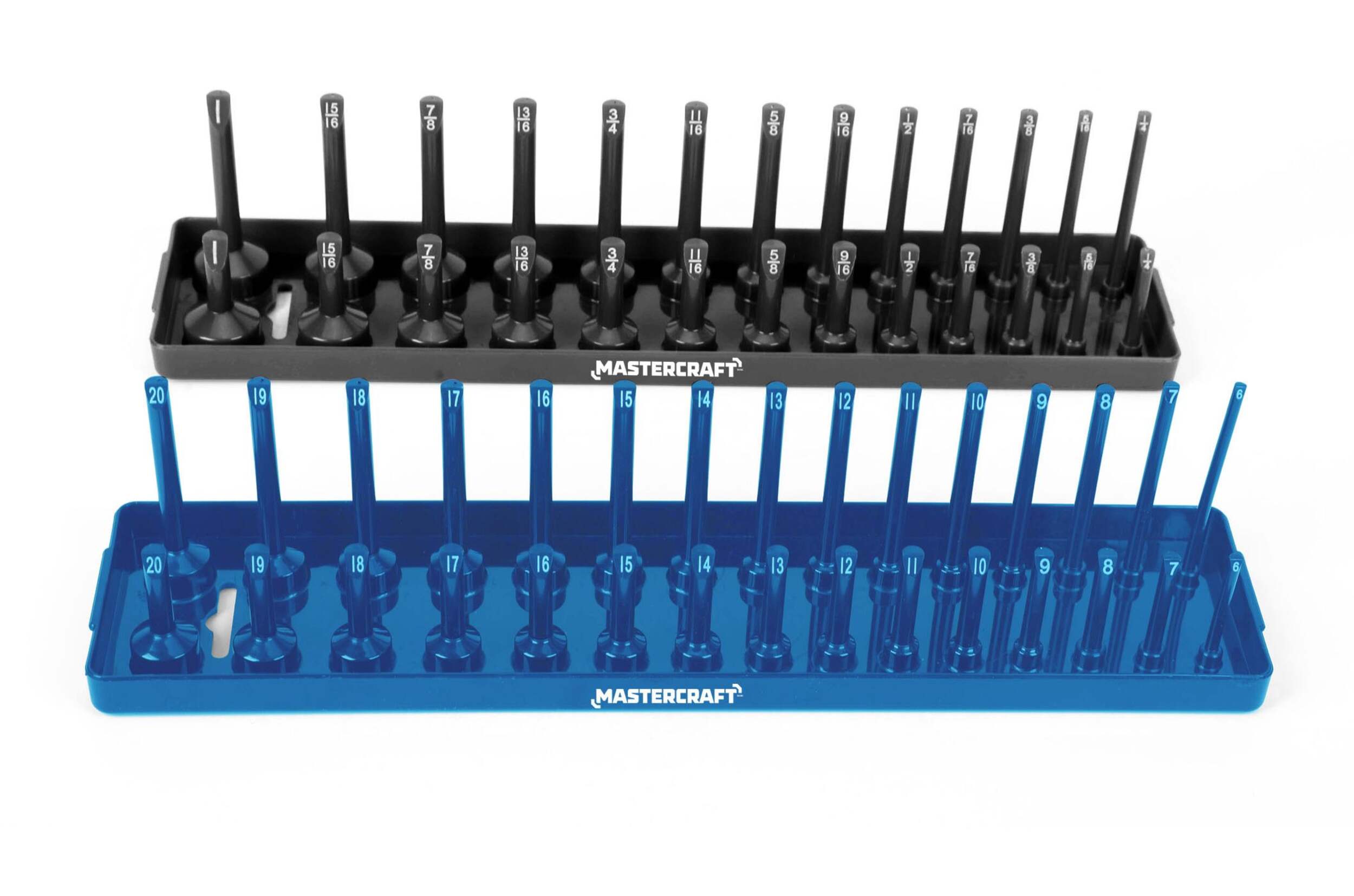 Plateau porte-douilles à prise de 3/8 po Mastercraft en paquet de 2 doté de tailles clairement indiquées sur les crochets pour faciliter la sélection
