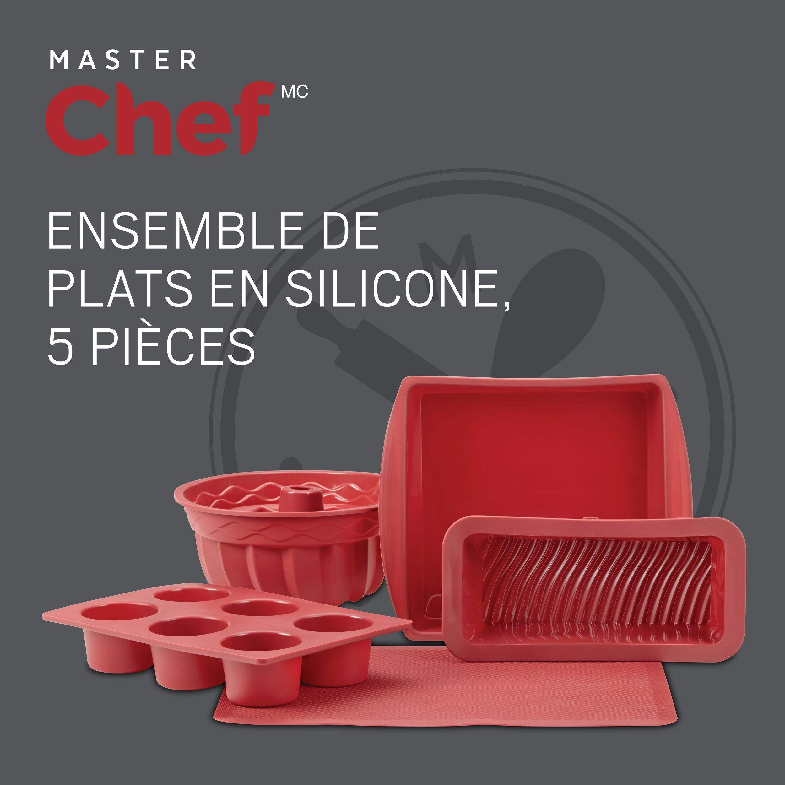 Plats de cuisson en silicone MASTER Chef de 5 pièces comprenant tout ce dont vous avez besoin pour faire cuire des muffins, du pain, des gâteaux et plus encore. Silicone de qualité alimentaire sécuritaire et conçu pour protéger vos comptoirs contre les rayures. Modèle flexible et surface antiadhésive facilitant le retrait des aliments. Plats de cuisson en silicone qui peuvent facilement passer du four au réfrigérateur et au lave-vaisselle sans s'user. Couleur canneberge élégante qui s'agence facilement à presque n'importe quel décor de cuisine.
