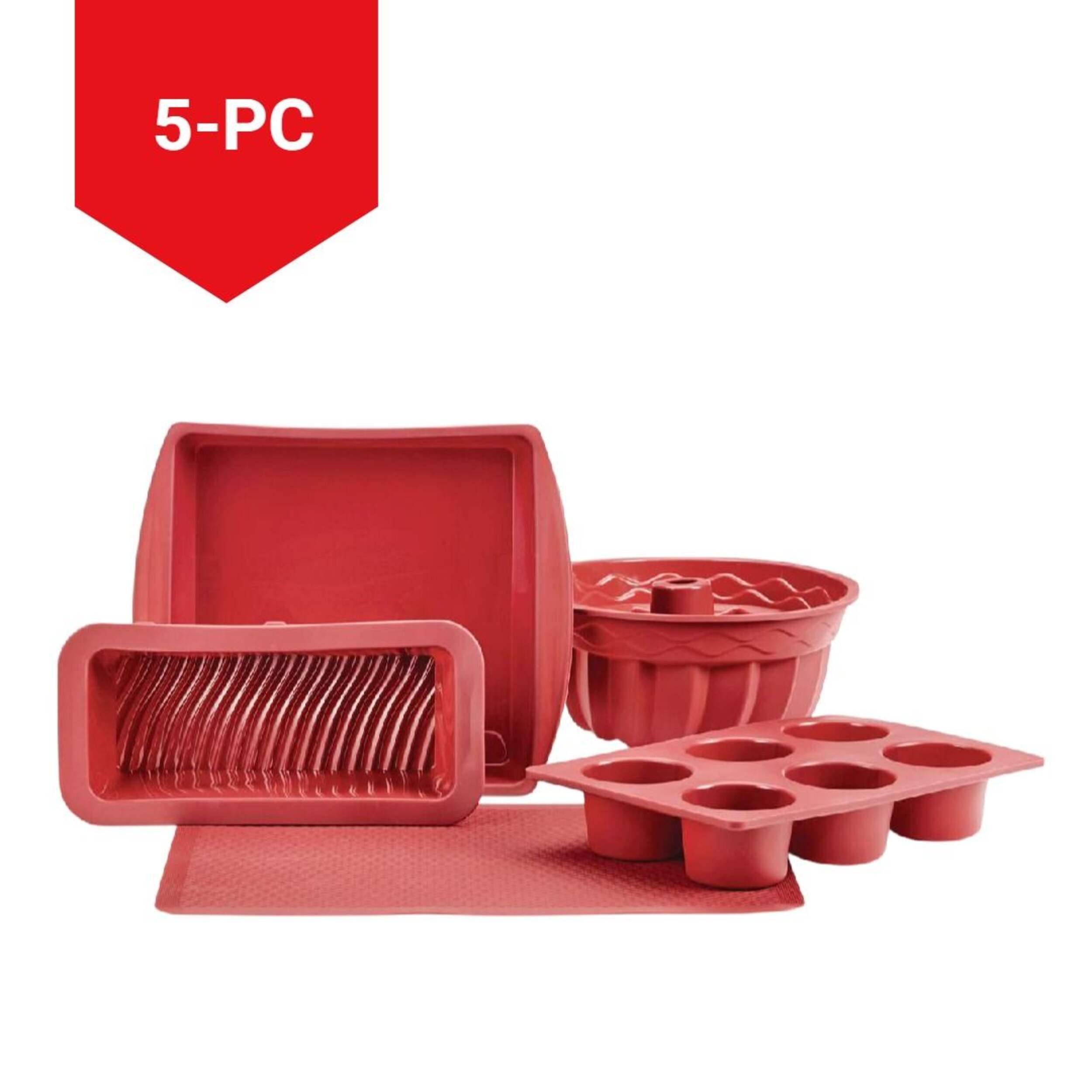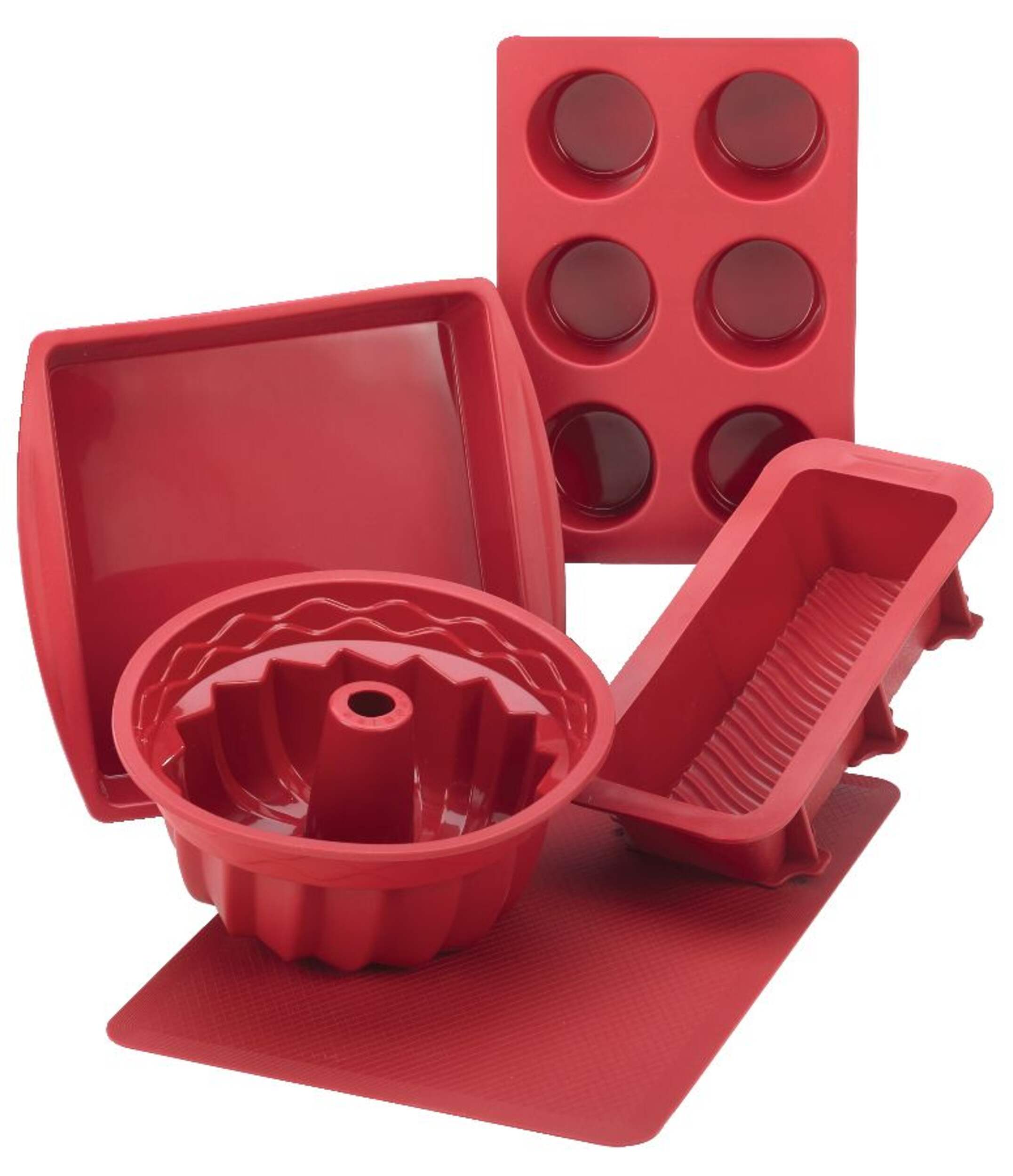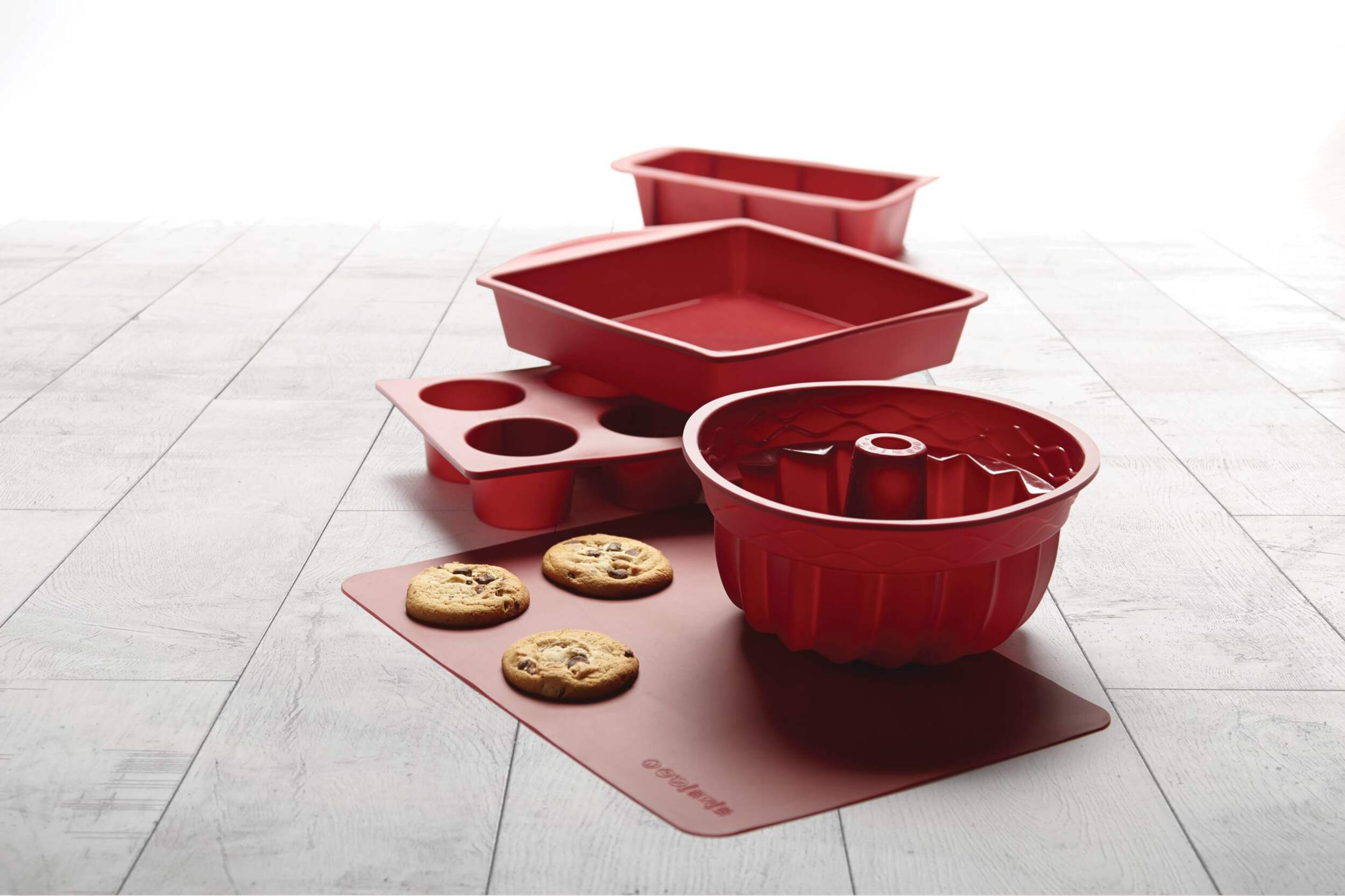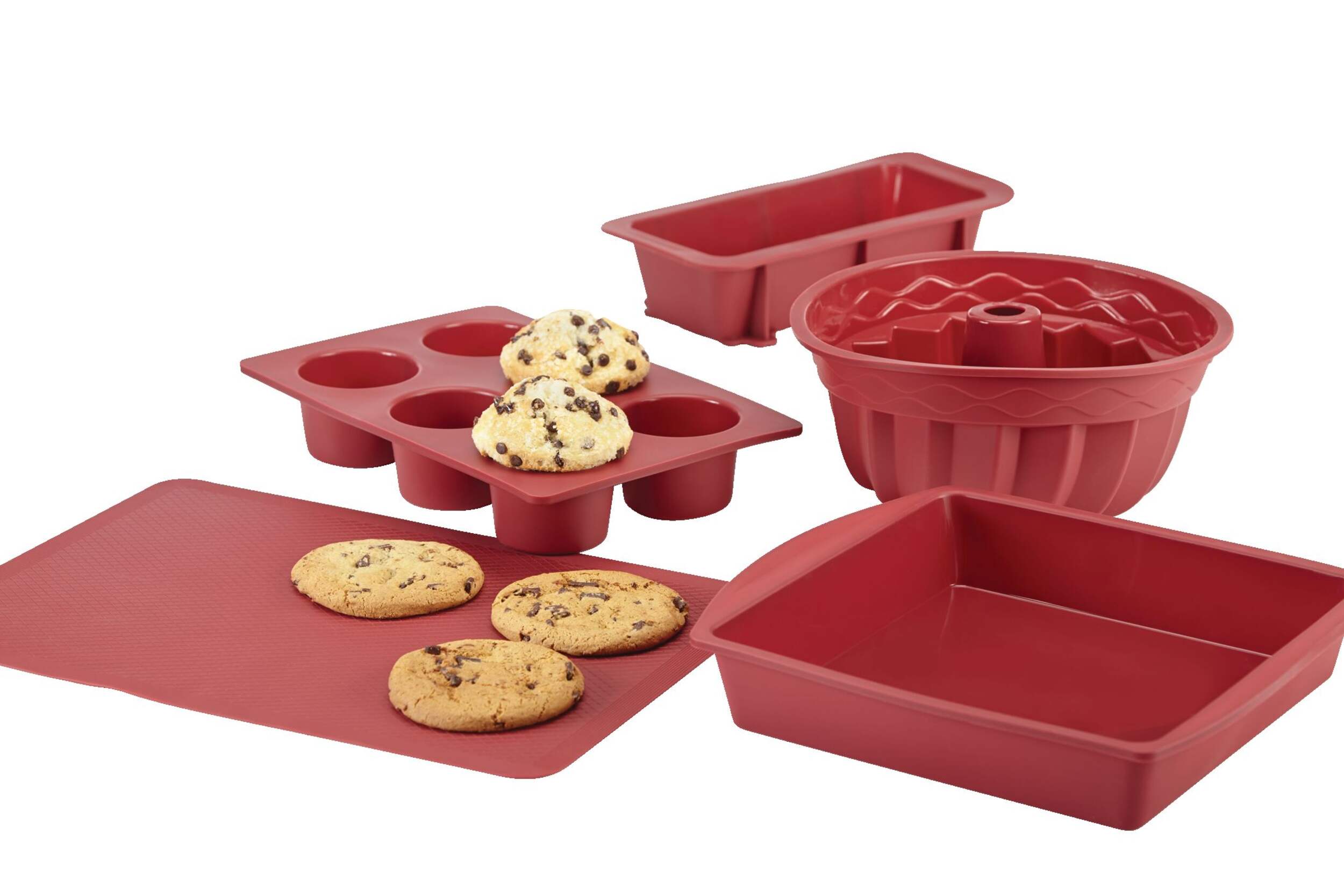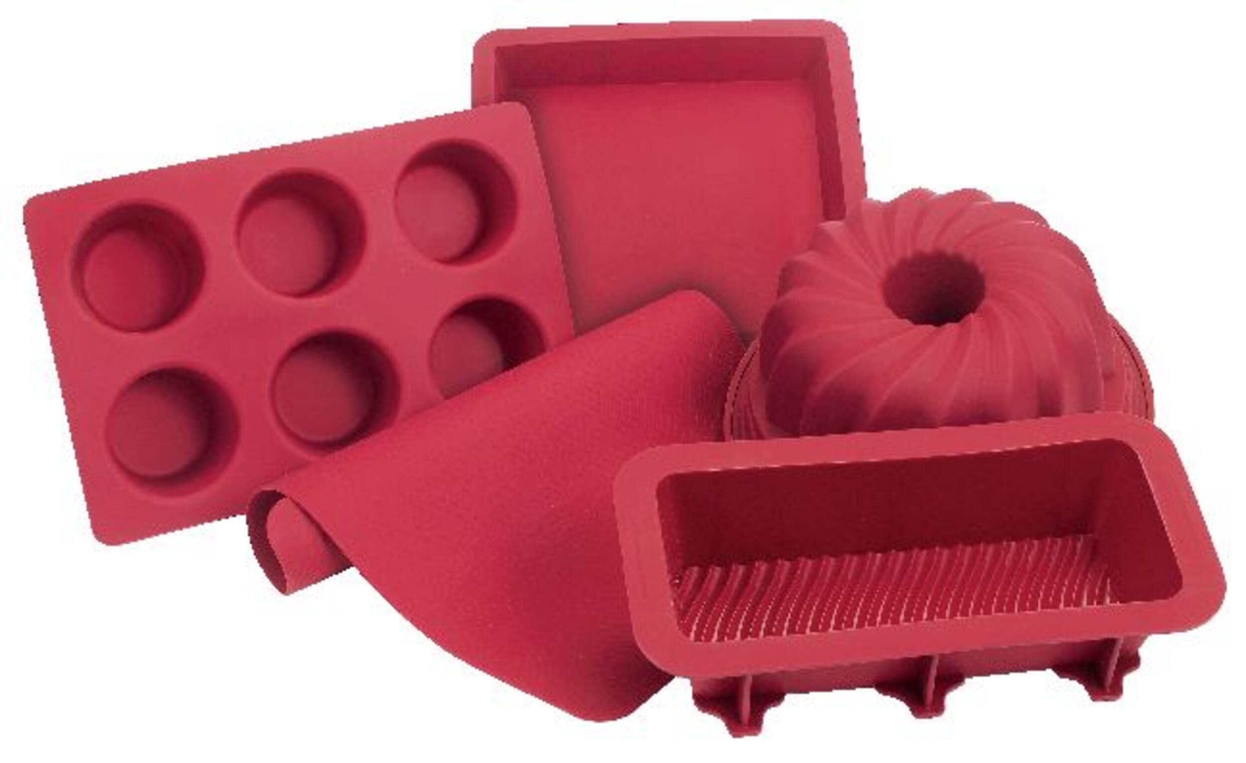 Ensemble de 5 pièces comprenant : Une feuille à biscuits en silicone (42-0900), un moule à 6 muffins en silicone (42-0902), un moule à pain moyen en silicone (42-0907), une moule à cheminée en silicone (42-0910) et un moule à gâteau carré en silicone (42-0913)