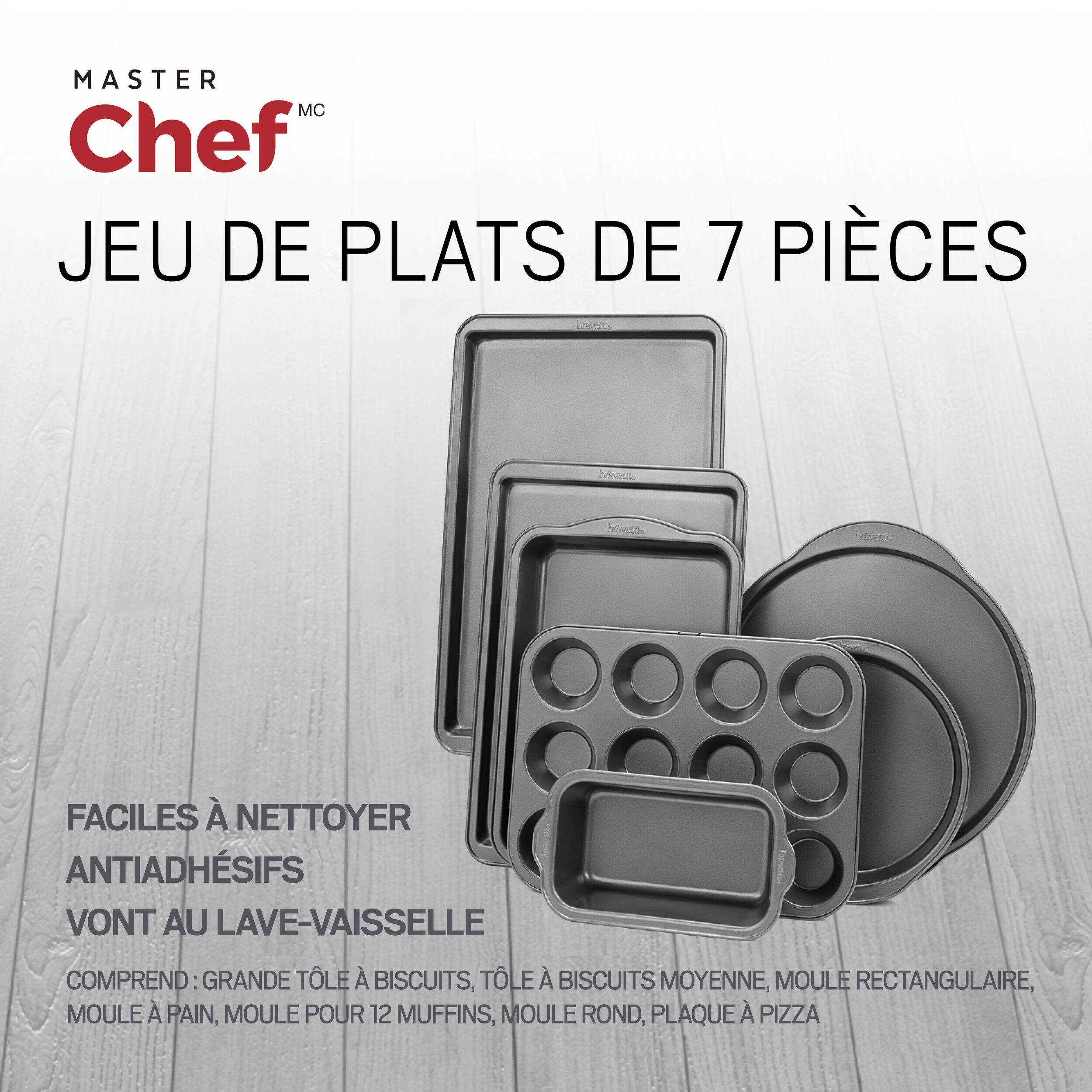 Repoussez les limites de talent en cuisine avec ces plats de cuisson antiadhésifs MASTER Chef. Parfait pour les apprentis ou les professionnels, cet ensemble complet comprend des plaques à biscuits, des moules à gâteau, des moules à muffins et plus encore. Les surfaces antiadhésives sans BPA vous permettent de préparer vos délicieuses pâtisseries sans qu'elles accrochent. Les poignées en métal pratiques permettent d'enfourner et de défourner les plaques avec facilité.