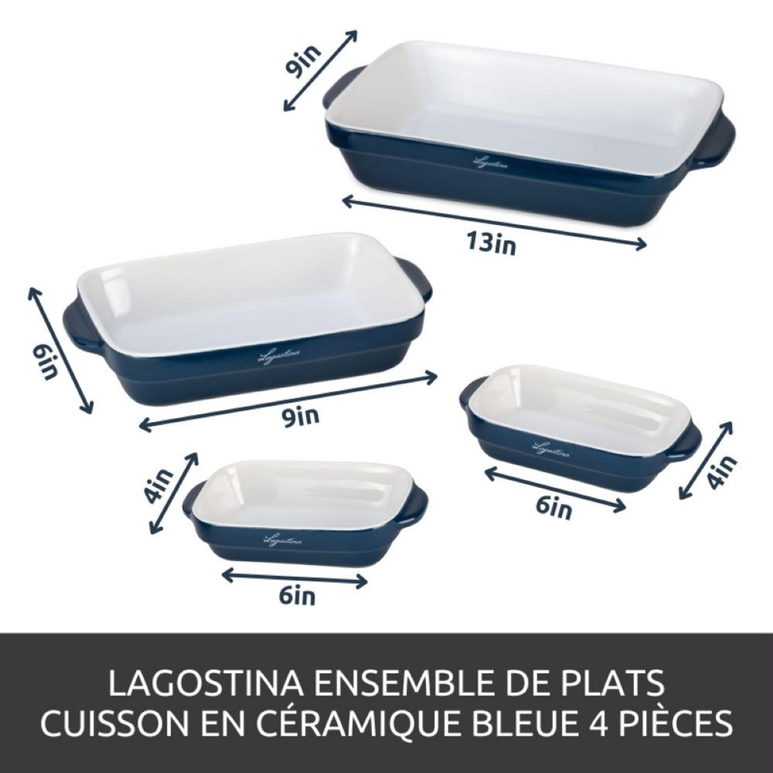 INCLUT : grand plat à lasagne (13 x 9 po), plat à cuisson moyen (9 x 6 po) et 2 petits plats à cuisson (6 x 4 po)