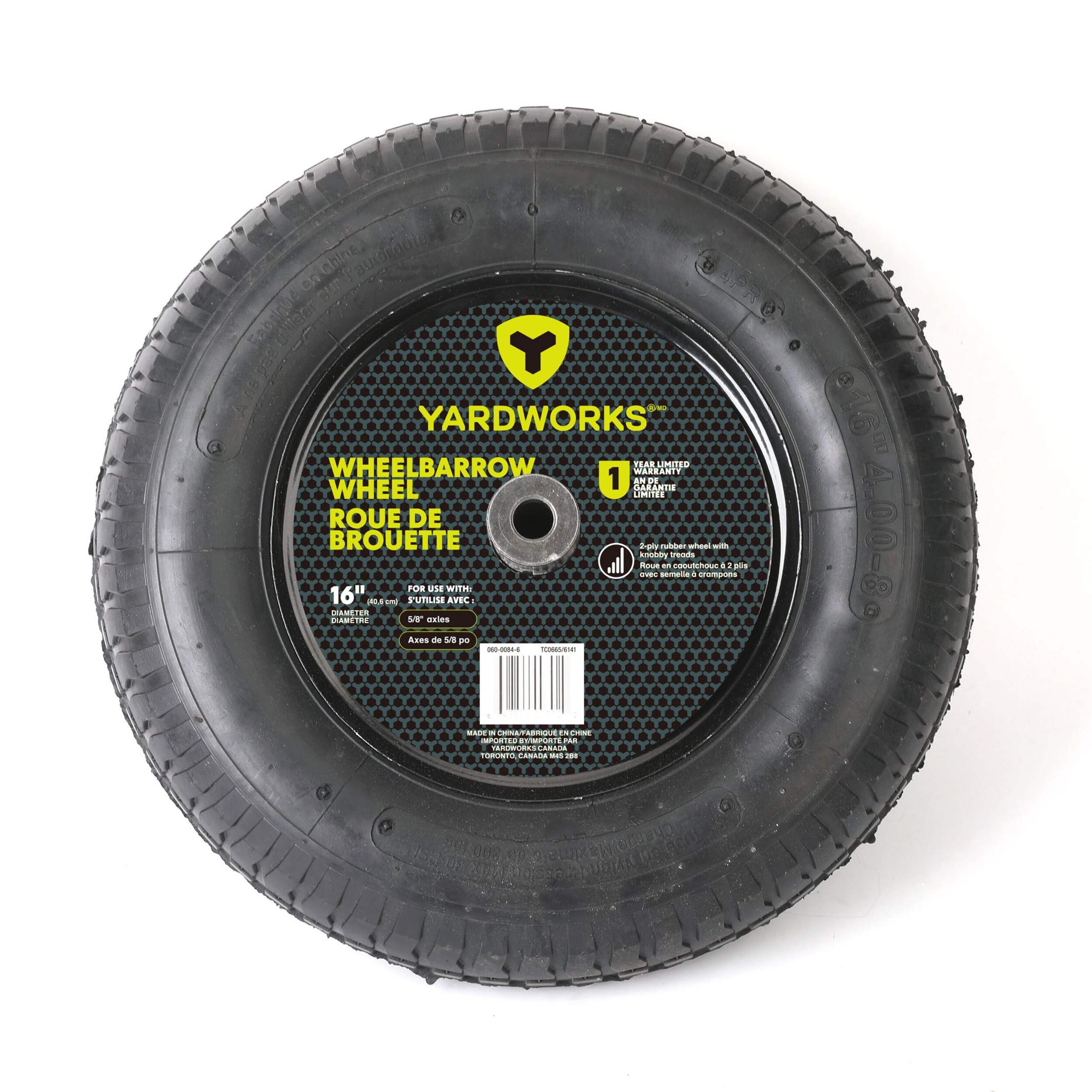 Le pneu/roue de rechange pour brouette Yardworks de 16 po est facile à utiliser et conçu pour s'adapter aux brouettes Yardworks. Il est doté de caoutchouc 2 plis et de bandes de roulement à crampons qui offrent des niveaux impressionnants de durabilité, d'adhérence et de stabilité.