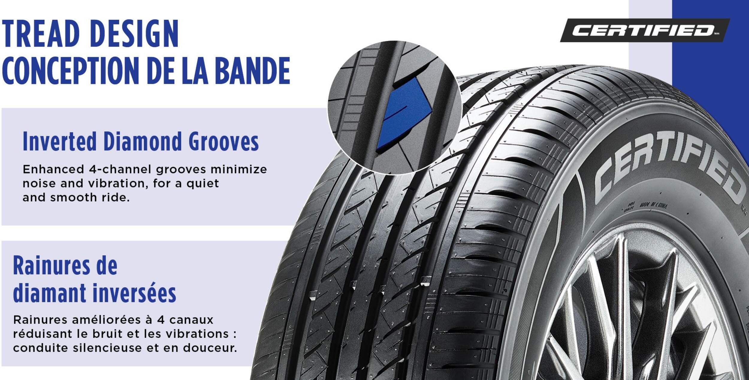 Le pneu toutes saisons Certified AllTrek pour voitures de tourisme et multisegments offre une conduite confortable et une maniabilité fiable par temps plus chaud. La bande de roulement du pneu est dotée de blocs centraux à angle peu profond qui assurent la stabilité à haute vitesse. La bande de roulement à rainures en losange inversé réduit le bruit et les vibrations pendant la conduite, ce pneu Certified AllTrek polyvalent est la solution idéale pour les voitures, les multisegments et les camionnettes de tout type.