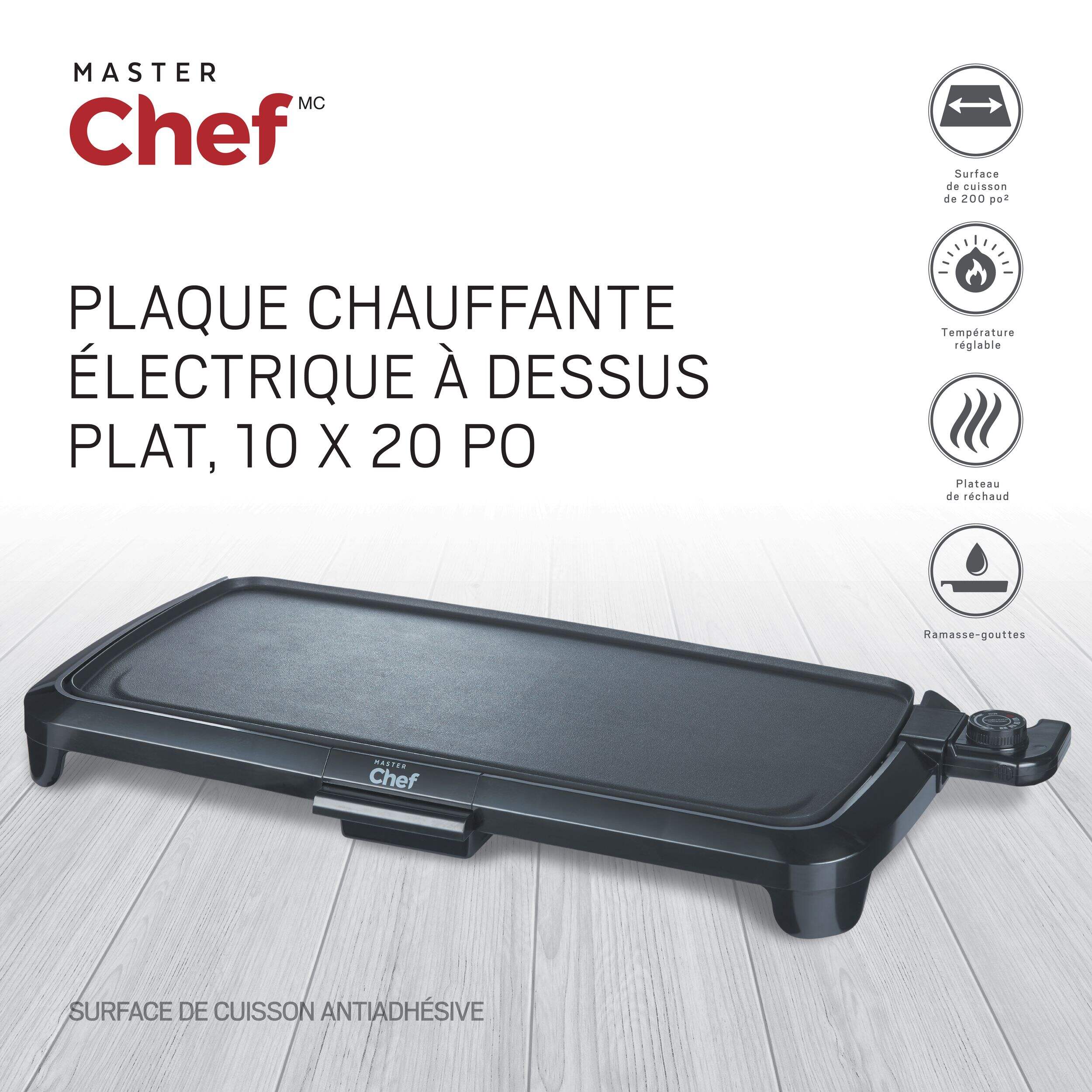 Que vous cuisiniez des crêpes ou fassiez frire vos viandes préférées, cette plaque chauffante électrique est le choix idéal. Plaque de cuisson à dessus plat MASTER Chef dotée d'une grande surface plane, ce qui vous permet de cuisiner pour une foule. Sur le côté, vous trouverez une jauge de température à cadran facile à utiliser, où vous pouvez régler la température de 90 à 220 °C (195 à 425 °F) pour trouver votre point idéal pour préparer tous vos plats préférés. La surface antiadhésive facilite le nettoyage et le voyant lumineux vous permet de régler la température de la plaque chauffante avec précision. Il y a aussi un plateau d'égouttage pour que vous puissiez frire des oeufs et d'autres aliments qui coulent sans vous soucier de faire des dégâts ou de tout renverser sur les comptoirs. Lorsque vous avez terminé la cuisson, le plateau de réchaud peut être utilisé pour garder les aliments chauds et délicieux pendant la préparation d'autres aliments ailleurs ou pour un service de style buffet.