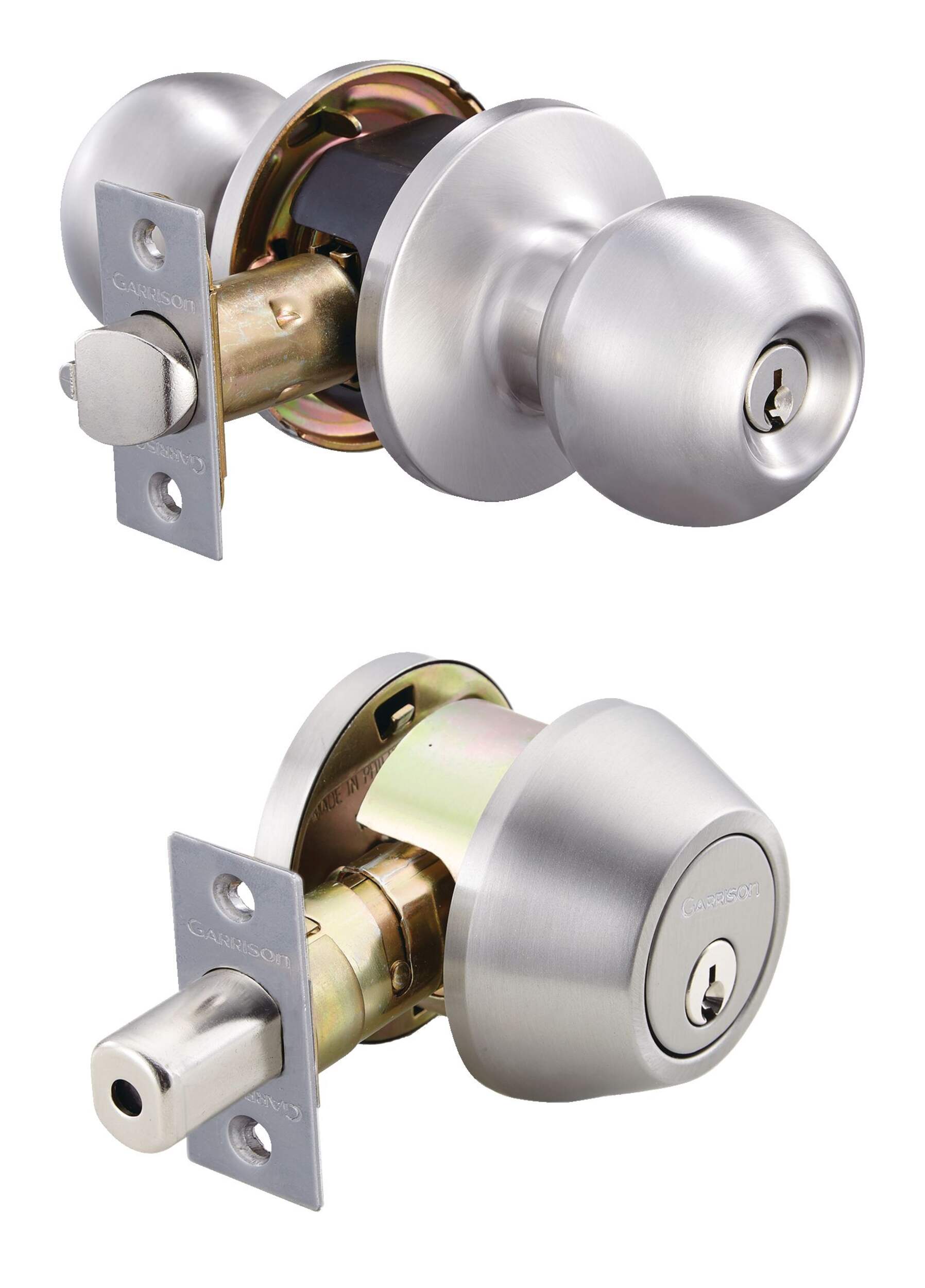 Poignée à boule et pêne dormant Garrison est un ensemble comprenant une poignée à boule et une serrure à pêne dormant pour portes extérieures