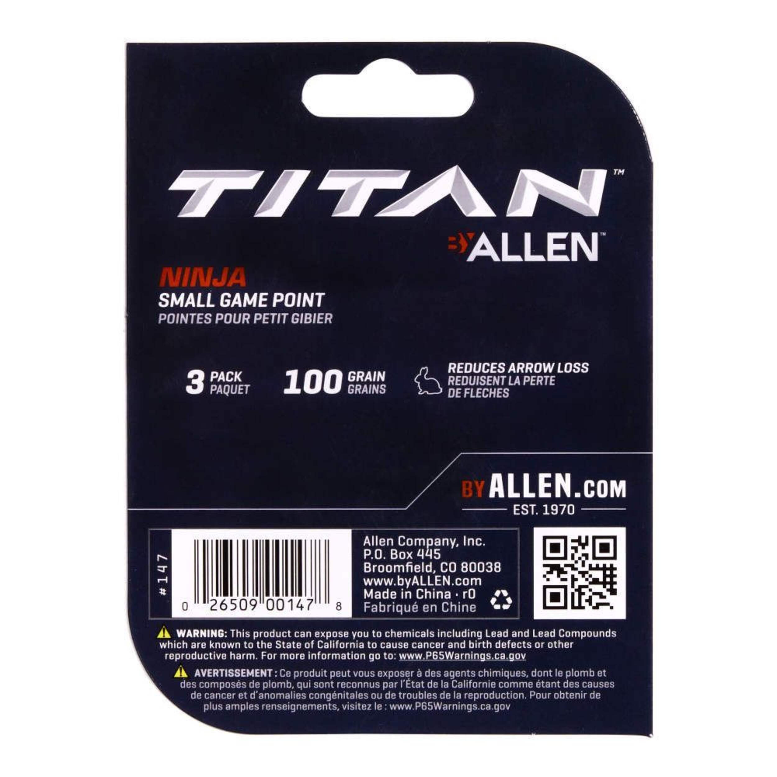 | Numéro de modèle de l’article | 147 : Titan 100 Grain Ninja Small Game Archery Point |