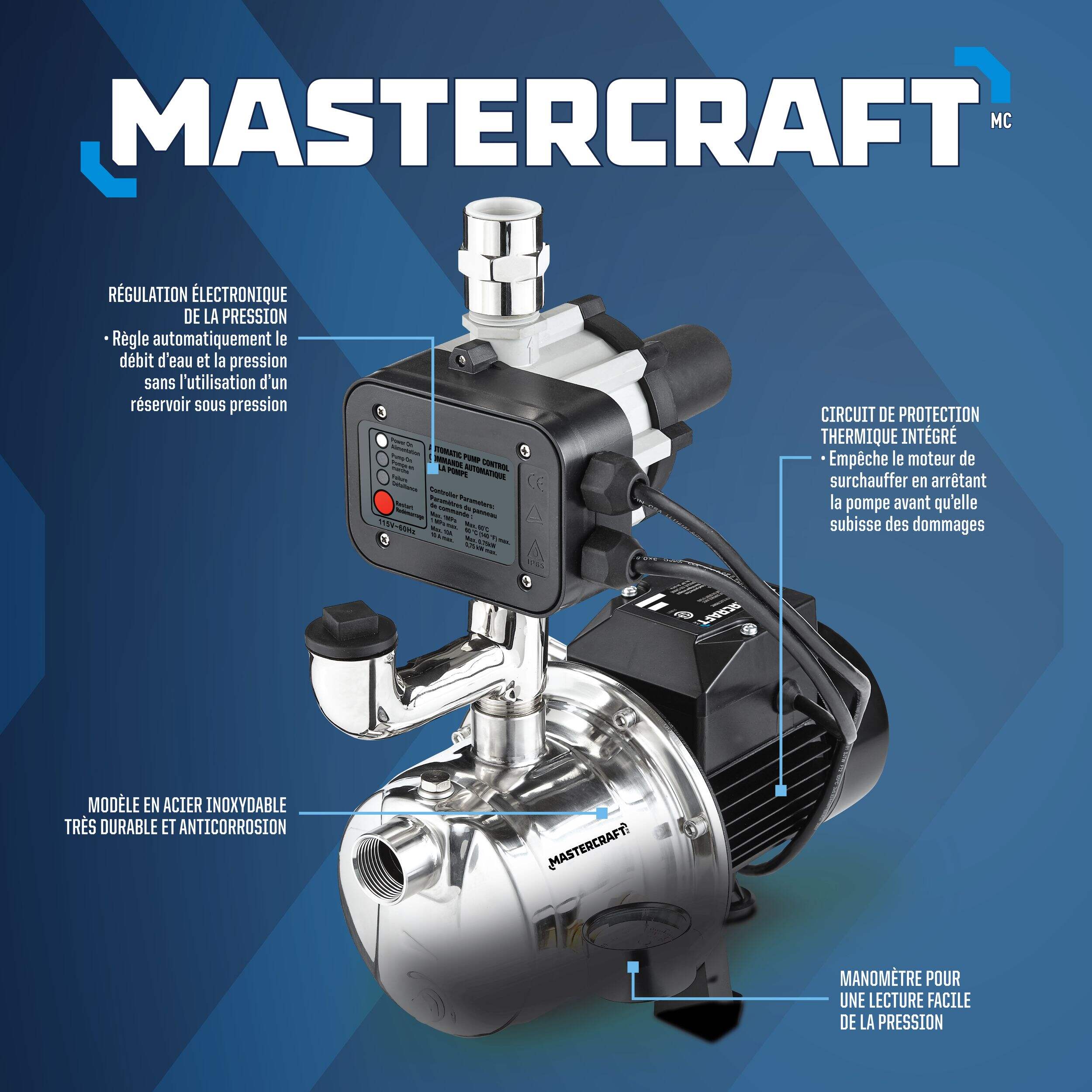 La commande électronique de pression règle automatiquement l'alimentation en eau et les niveaux de pression, permettant ainsi de ne pas avoir besoin d'un réservoir d'eau