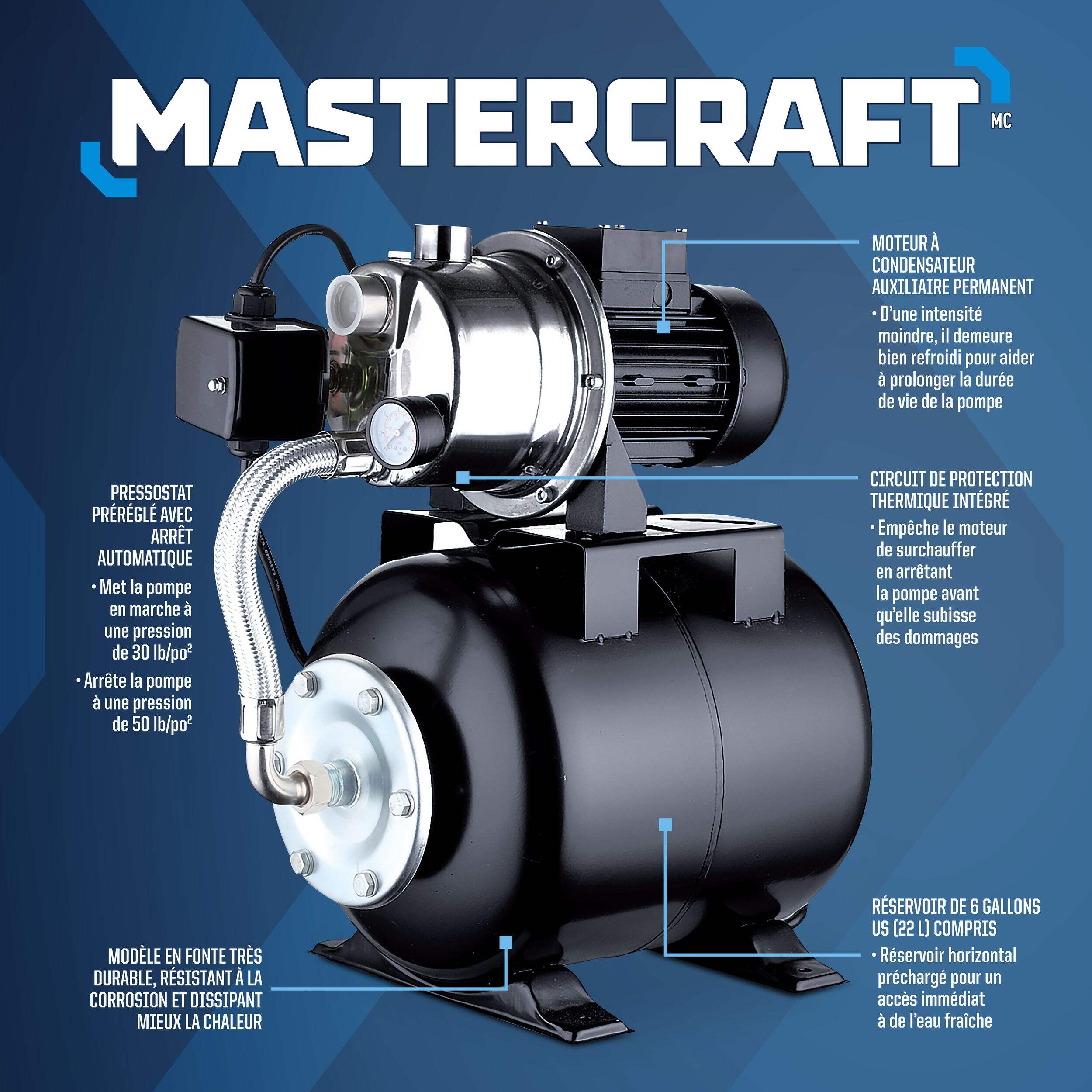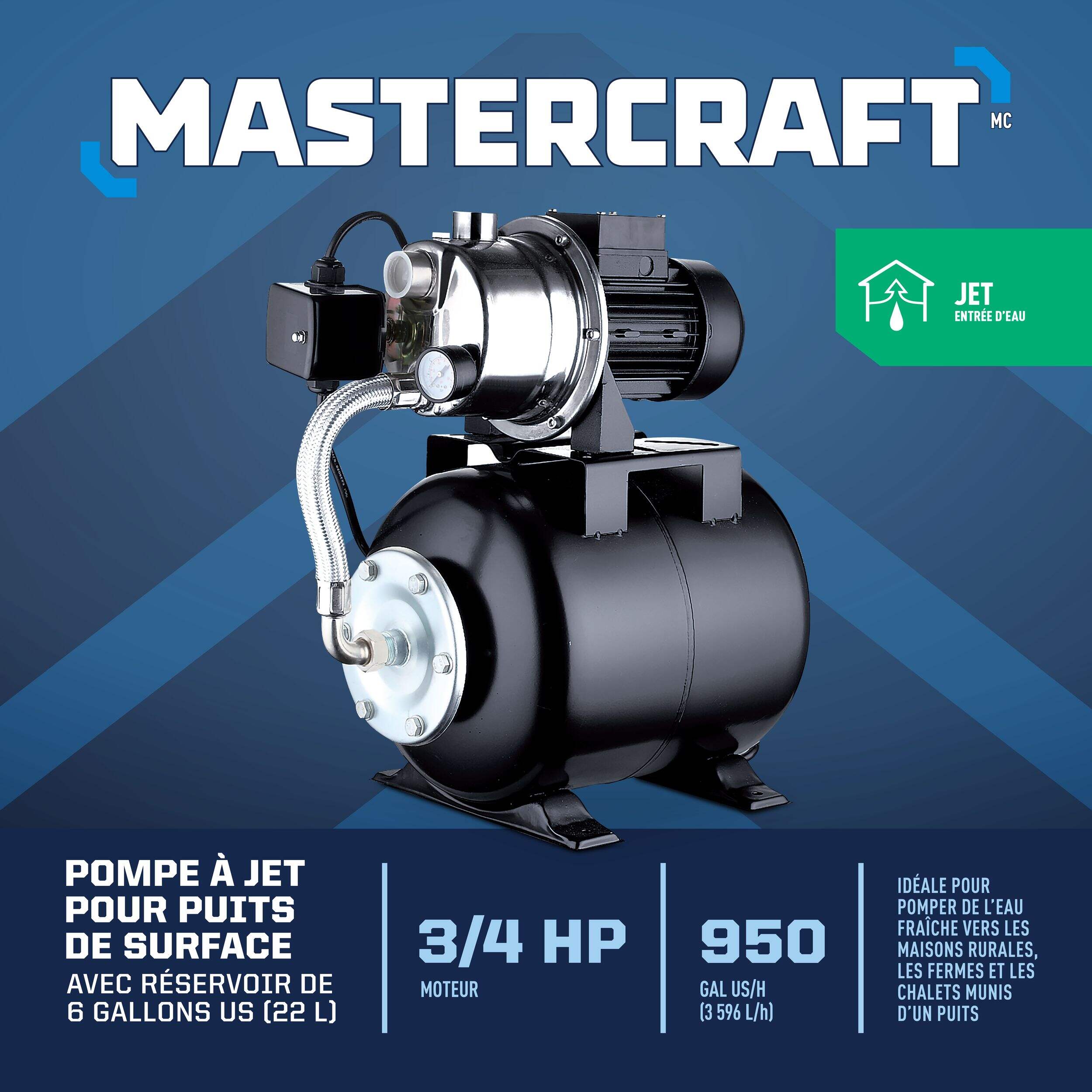La pompe à jet pour puits peu profond Mastercraft en acier inoxydable de 3/4 HP est la solution idéale pour approvisionner les maisons rurales, les fermes et les chalets avec puits en eau fraîche. Alimentée par un moteur de 3/4 HP, cette pompe à jet haute performance assure une alimentation en eau fiable pour vos besoins. Très durable et résistante à la corrosion, la pompe offre des années d'utilisation fiable. Cette pompe à jet comprend un réservoir horizontal préchargé qui permet un accès immédiat à l'eau fraîche au besoin.