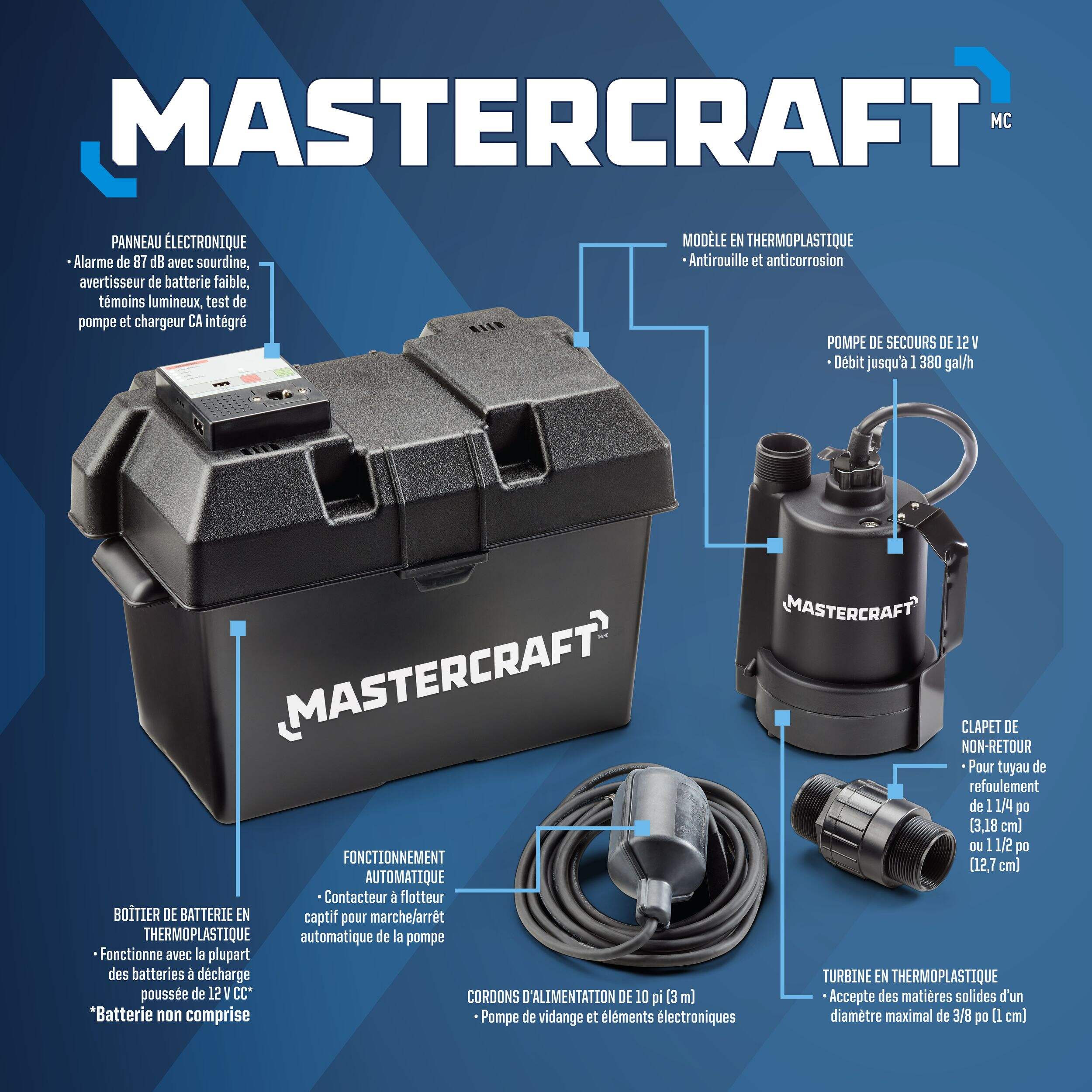 Pompe de puisard de secours avec pompe c.c. de 12 V Mastercraft qui assure une alimentation d'urgence en cas d'inondation ou de panne de la pompe principale