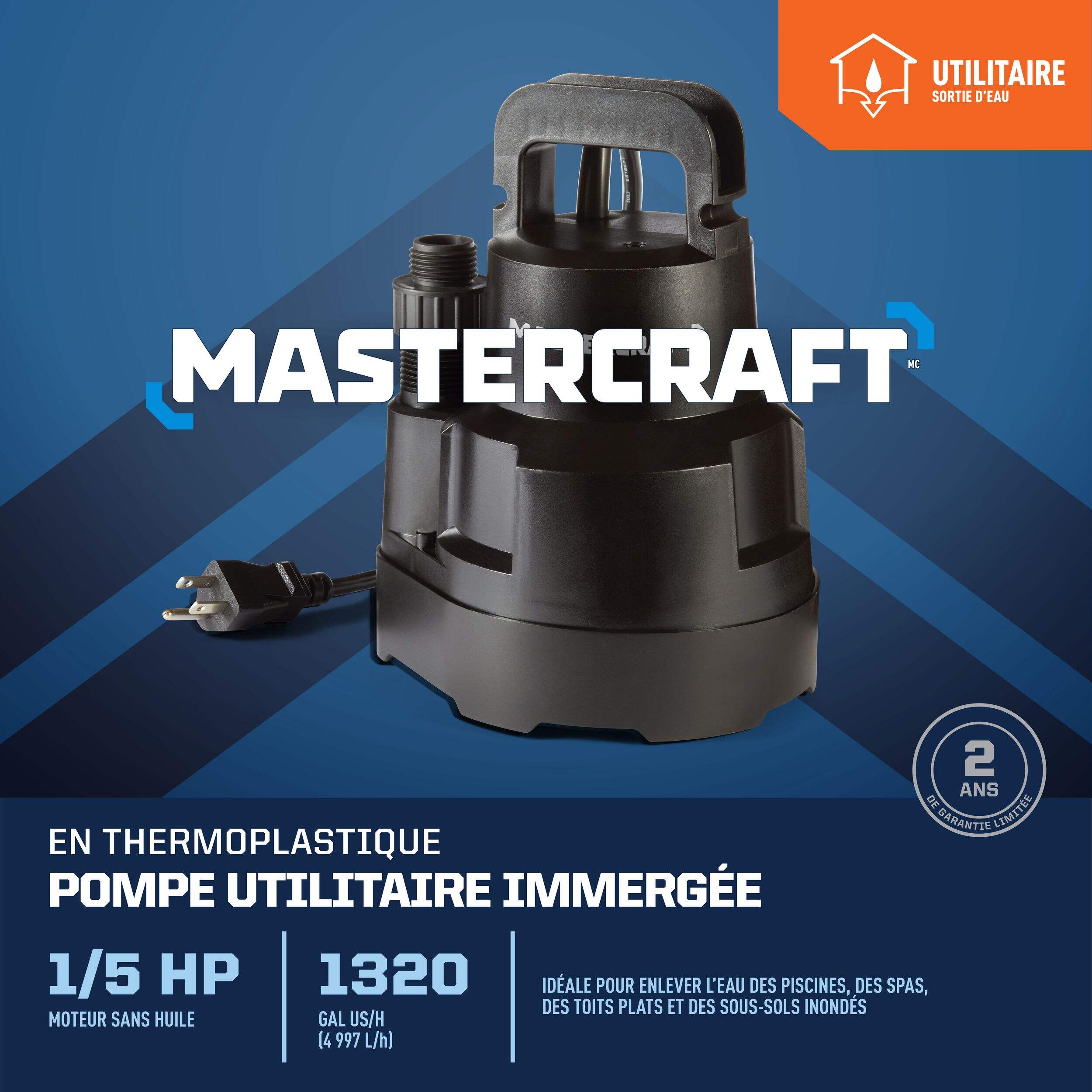 Gérez efficacement l'eau dans plusieurs endroits grâce à la pompe tout usage submersible Mastercraft, 1/5 HP. Conçue pour une installation temporaire, cette pompe électrique tout usage est idéale pour évacuer l'eau rapidement. Alimentée par un moteur longue durée sans l'huile de 1/5 HP, cette pompe tout usage submersible offre un débit maximal de 4997 L/h (1320 gal/h). Cette pompe d'évier tout usage est dotée d'une grille d'entrée spéciale qui réduit le risque d'obstruction et d'endommagement de la pompe en filtrant les gravillons et autres débris.