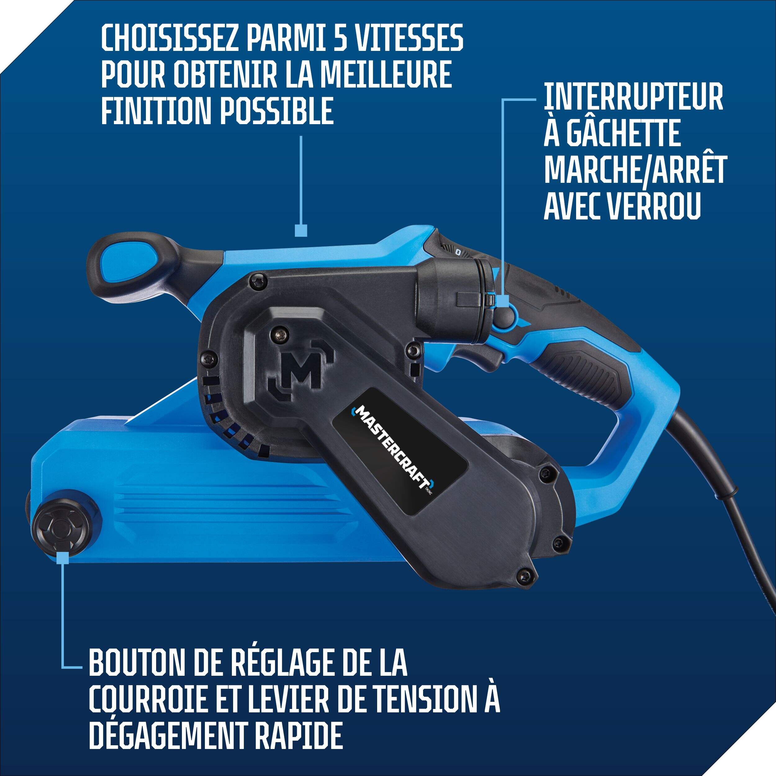 La ponceuse à courroie à fil à 5 vitesses Mastercraft de 6 A est un outil polyvalent conçu pour tous les projets de ponçage, du lissage du bois brut à la rénovation de meubles. Le sac ramasse-poussière intégré avec fermeture à glissière aide à maintenir un espace de travail propre en capturant les débris, tandis que l'interrupteur de déclenchement verrouillable rend les longues séances de ponçage plus confortables, vous permettant de vous concentrer sur le travail à accomplir. La ponceuse est également offerte avec une bande de ponçage de 80 grains, ce qui vous permet de commencer immédiatement.