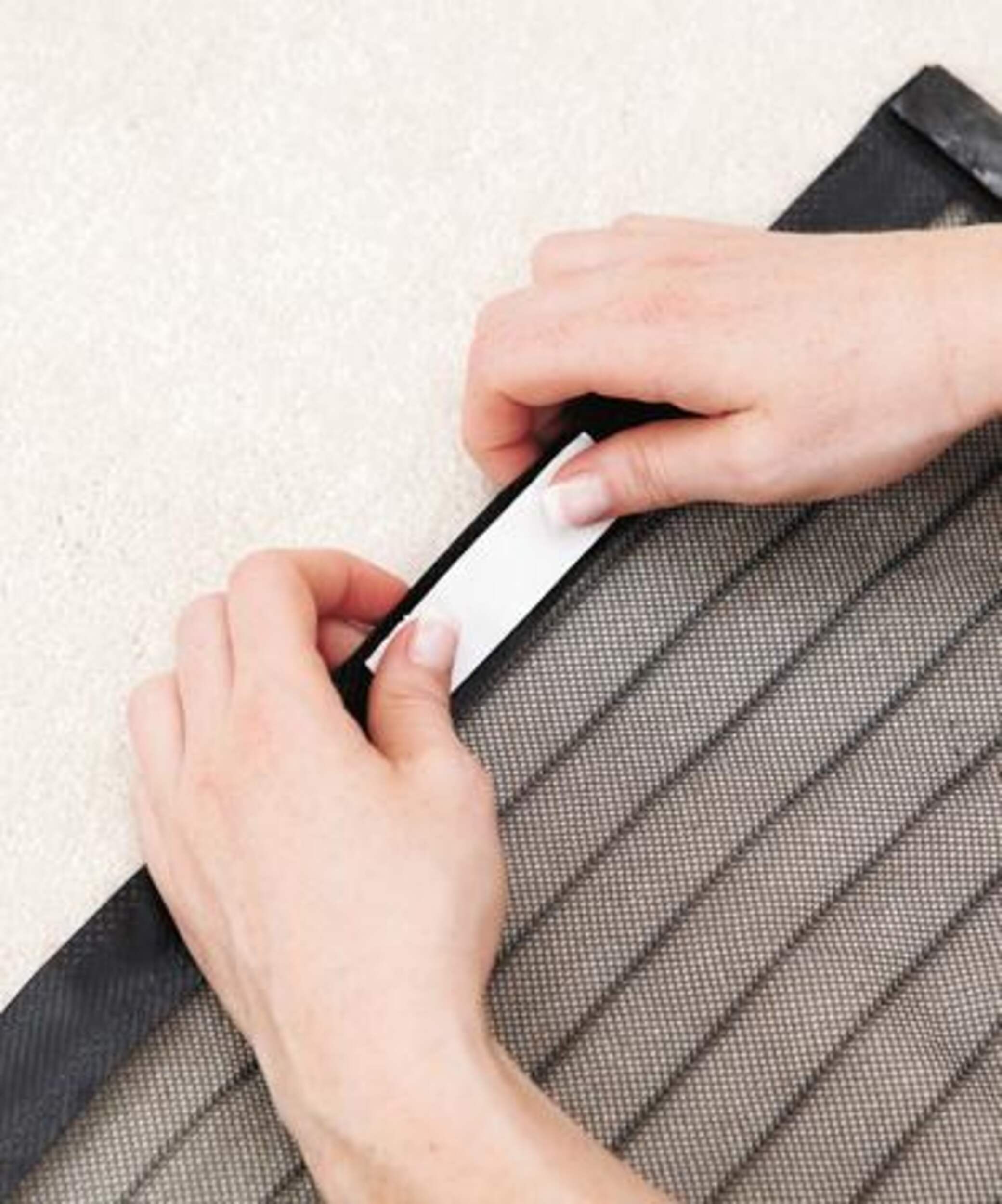Installation en un panneau simple — aucun outil requis; retirez l’adhésif des fermetures autoagrippantes et fixez-les au cadre de la porte