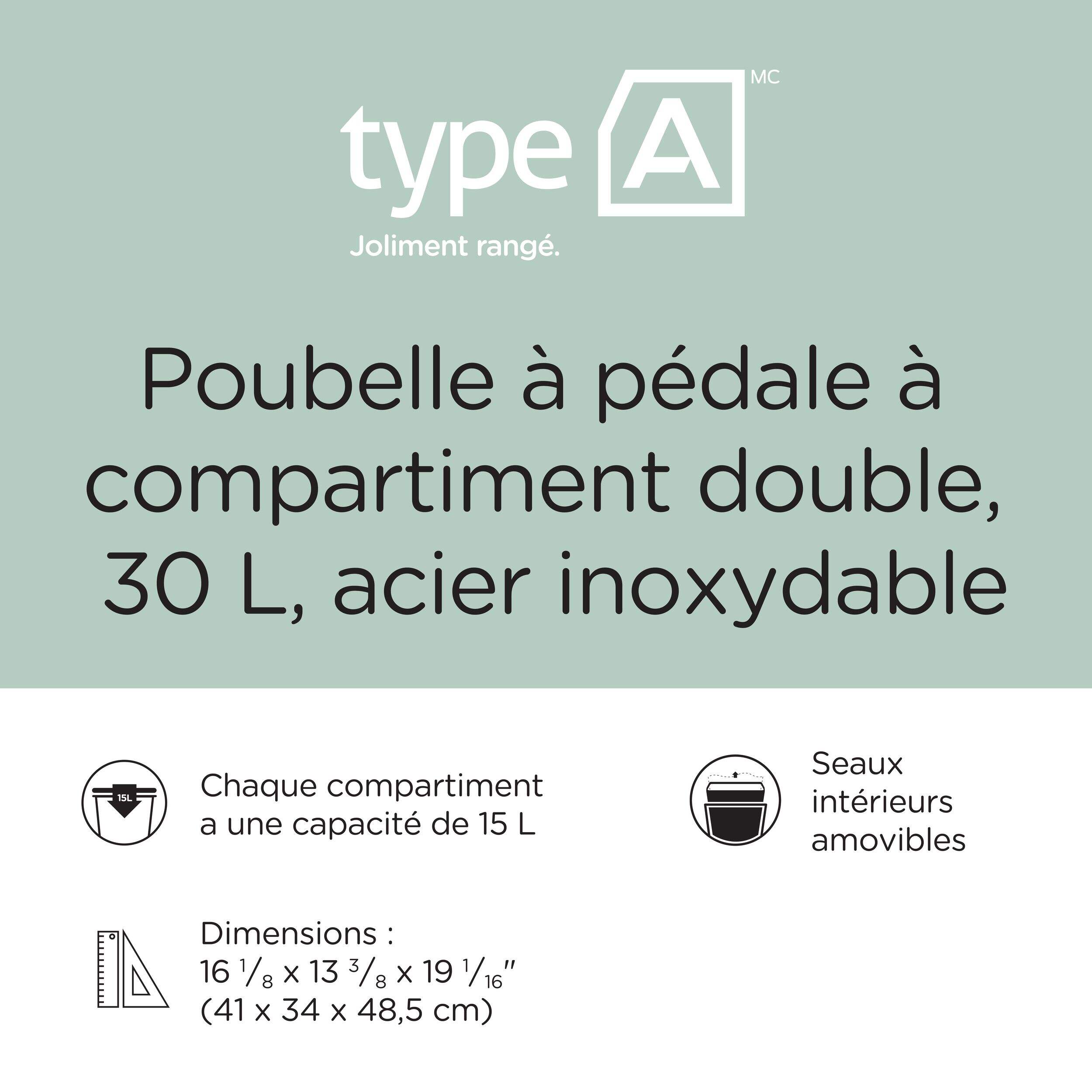 La poubelle rectangulaire en acier inoxydable à 2 compartiments Type A permet de séparer efficacement les ordures ménagères des déchets recyclables ou organiques. Chaque compartiment est doté d'une doublure amovible avec poignée de transport pour faciliter le vidage. Les 2 pédales permettent une ouverture mains libres des couvercles pour préserver la propreté et l'hygiène. La capacité de 15 L par côté rend cette poubelle pratique et durable pour une utilisation quotidienne.