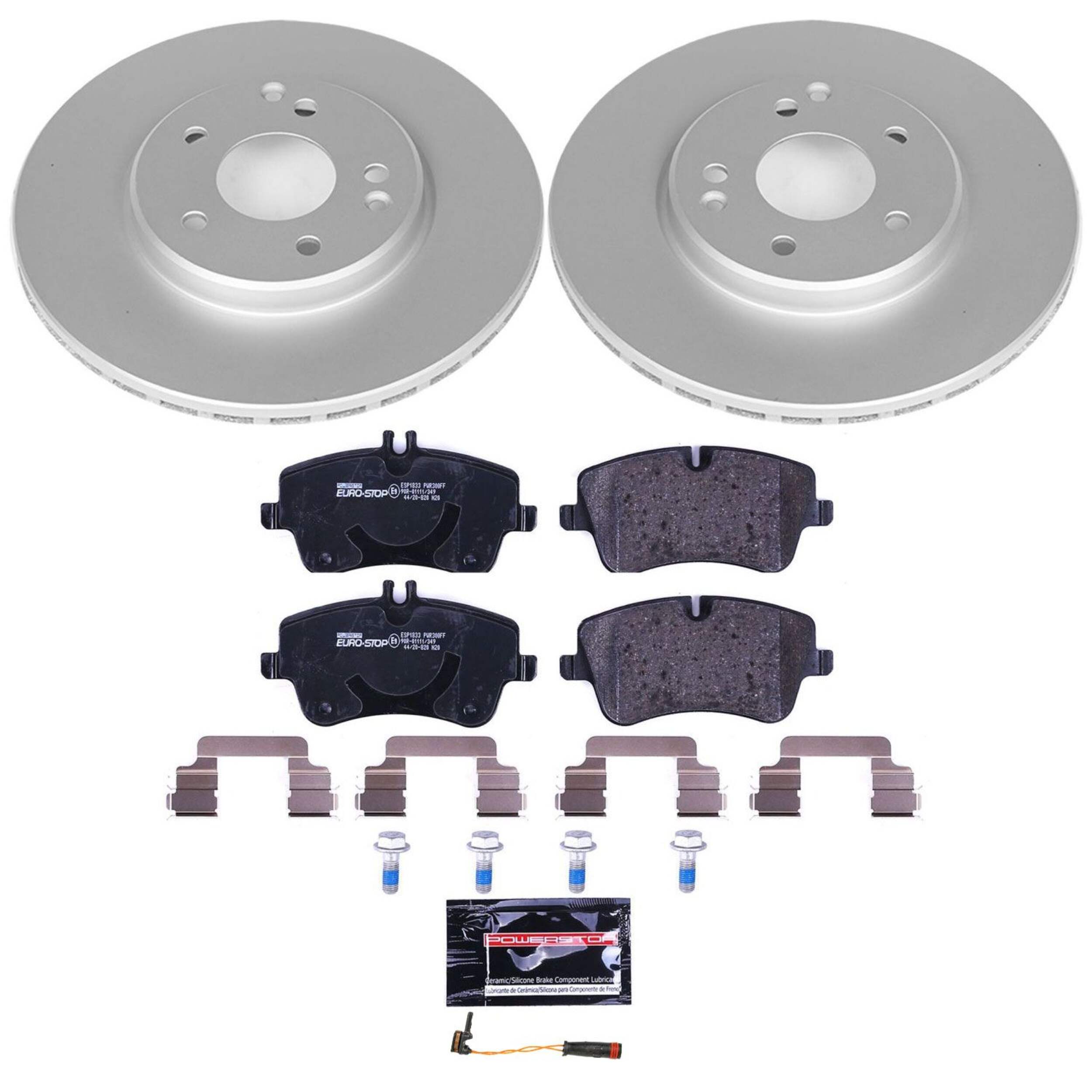 Comprend un jeu de plaquettes de frein Euro-Stop et le matériel d’installation de choix en acier inoxydable