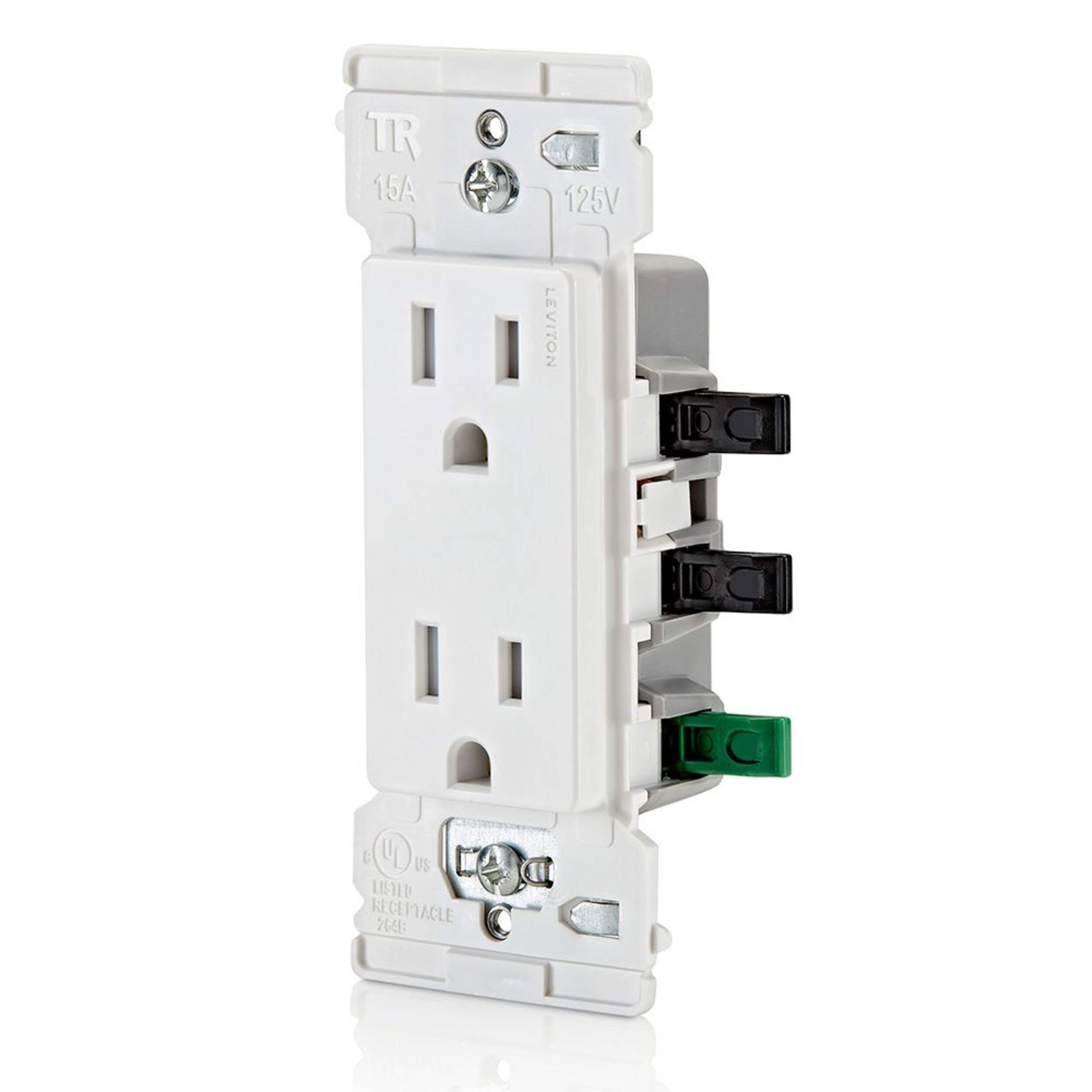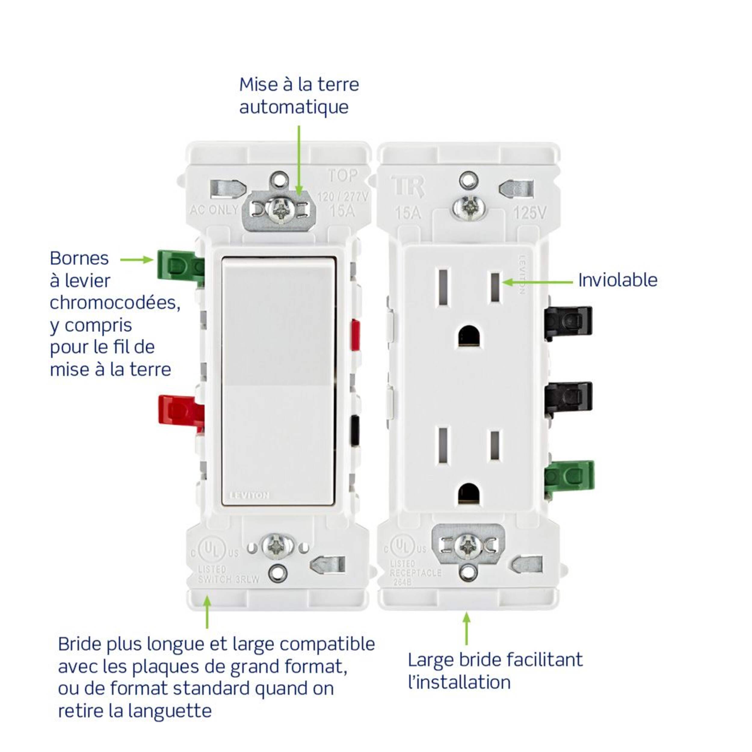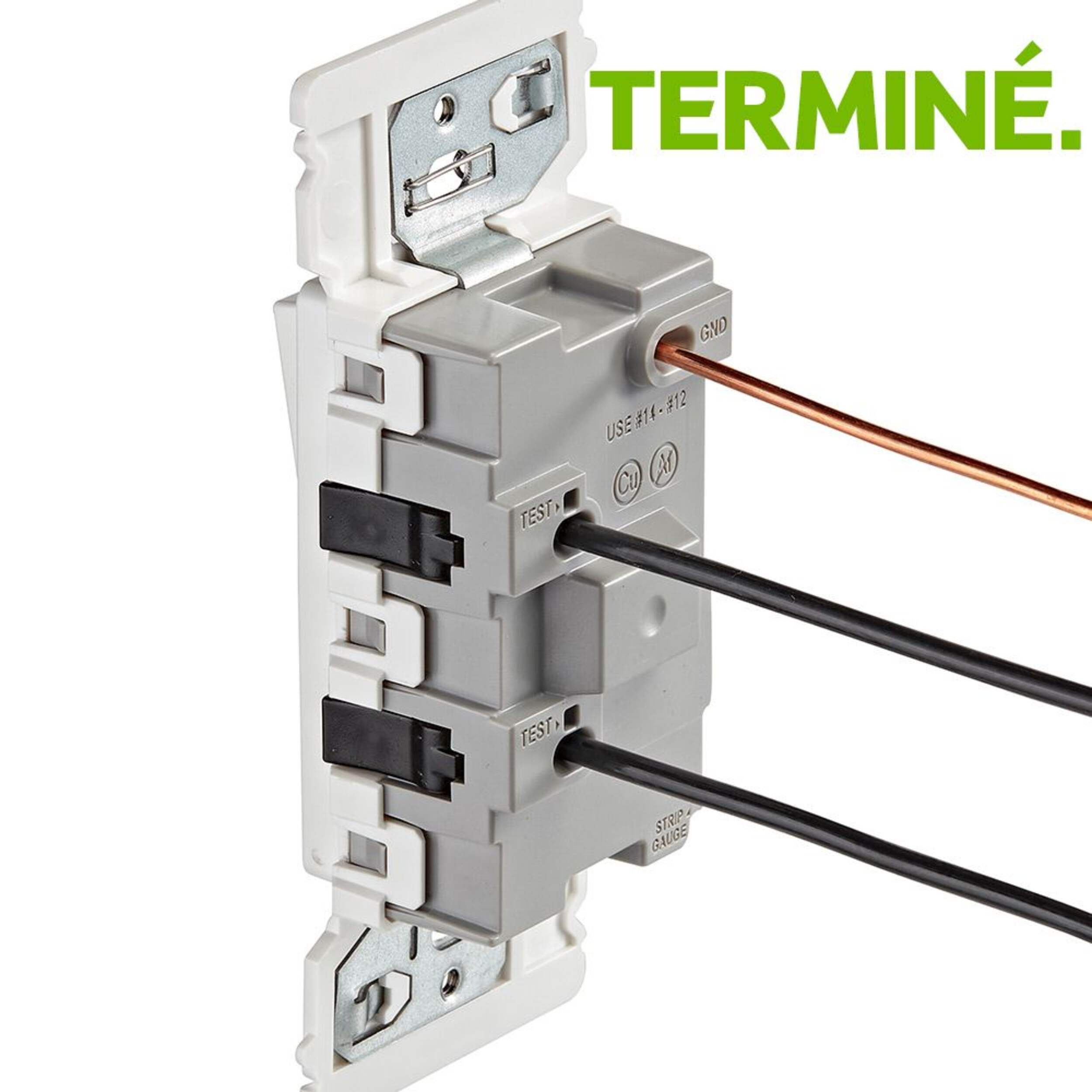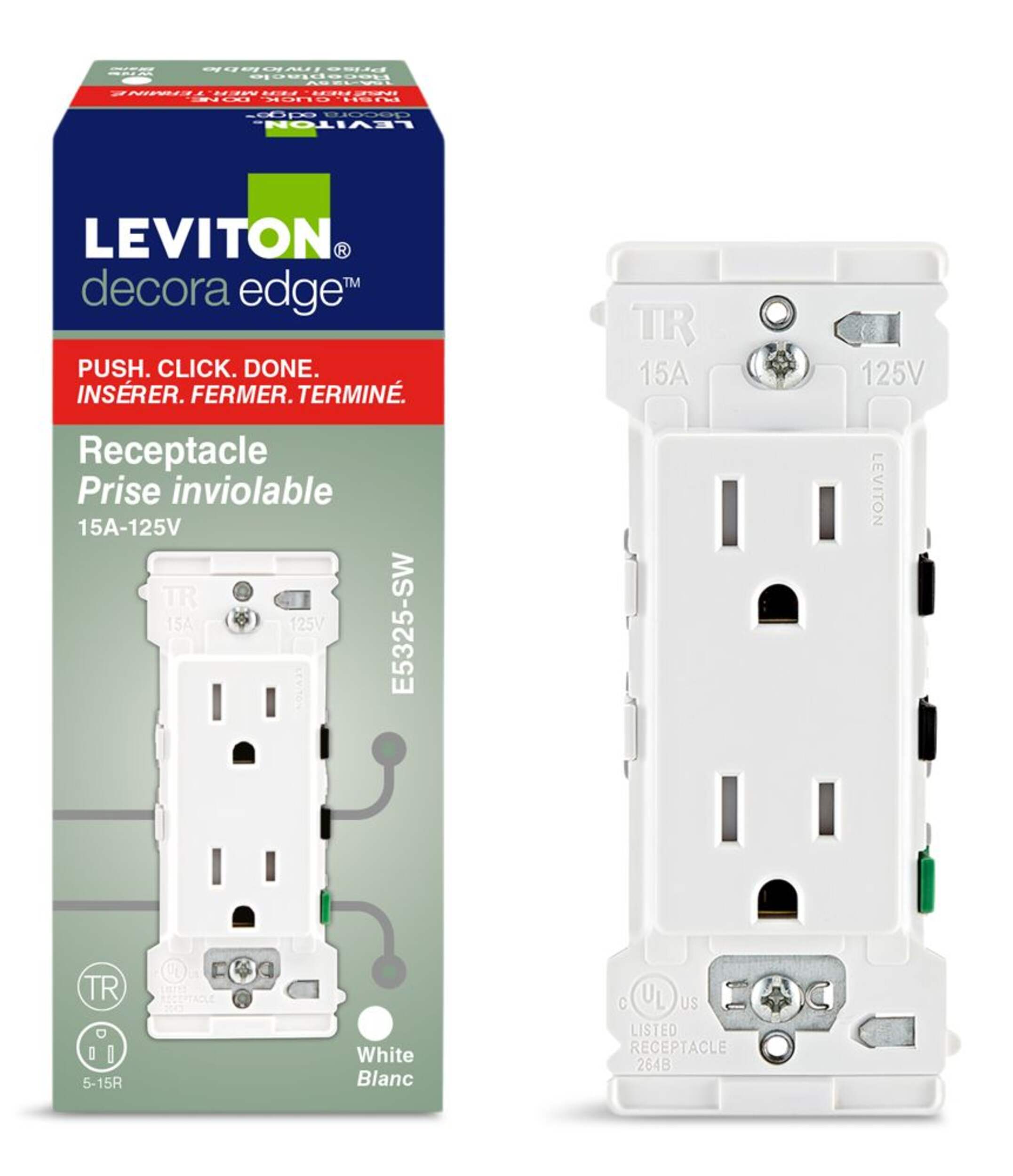 Prise de courant Leviton Decora Edge 15 A 125 V plus rapide, plus sécuritaire et plus facile à installer grâce à sa fonctionnalité Push, Click, Done