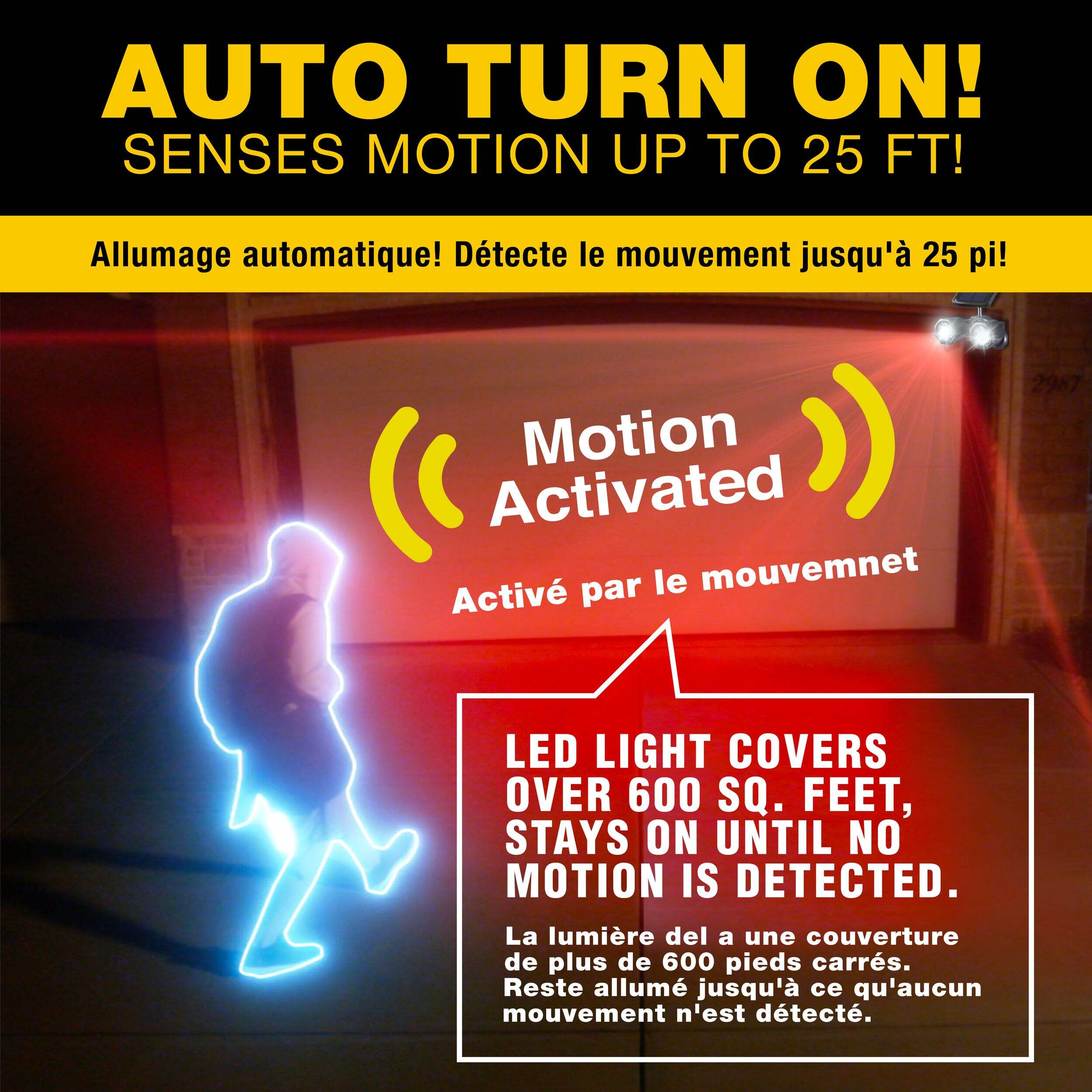 S’allume automatiquement lorsqu’un mouvement est détecté jusqu’à 25 pi (7,6 m)