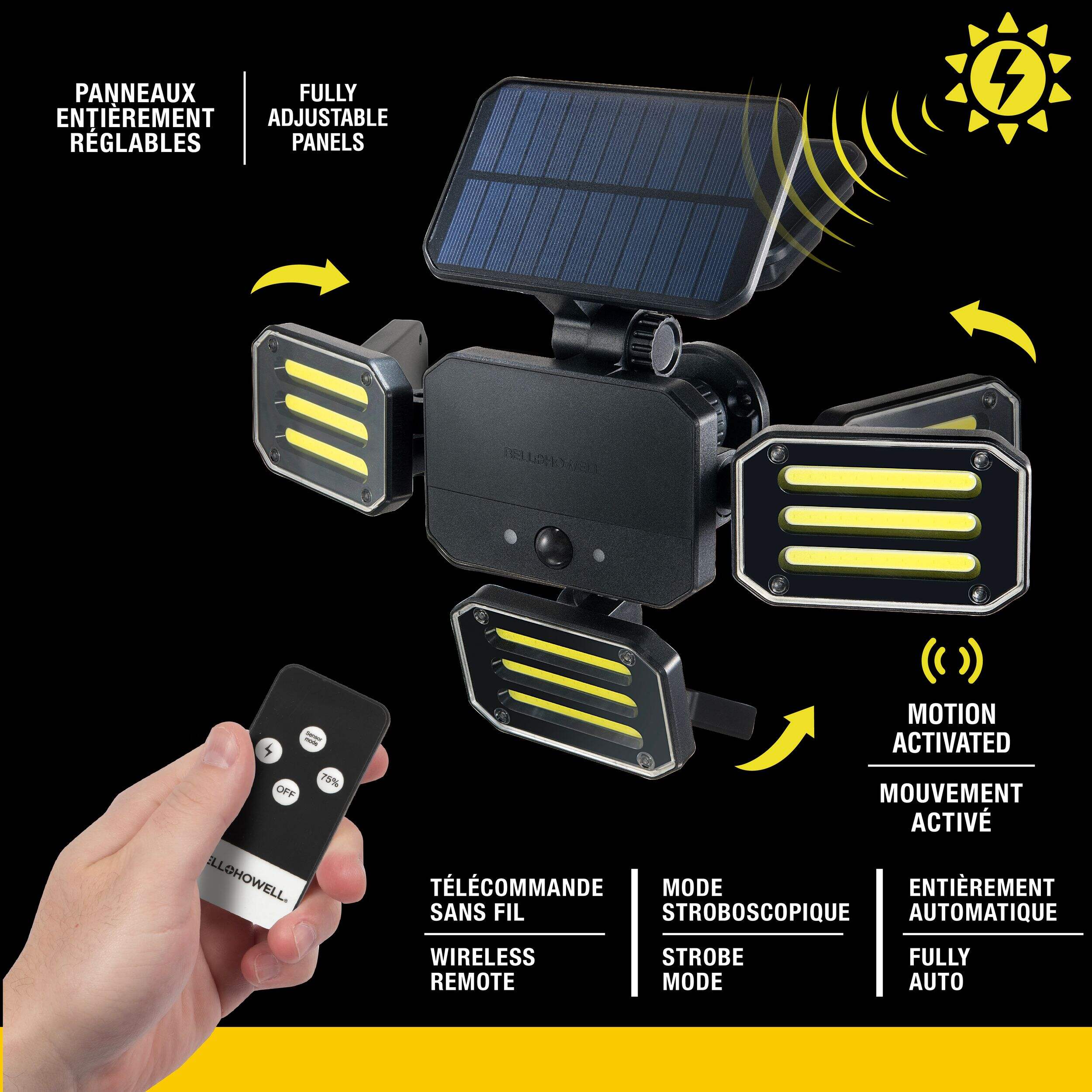 Améliorez votre éclairage extérieur avec le projecteur solaire Bell & Howell Bionic, comme à la télé, une solution d'éclairage sans tracas. Ce projecteur offre un éclairage puissant et lumineux chaque fois qu'un mouvement est détecté. Alimenté entièrement par l'énergie solaire, le projecteur Bionic permet une installation simple et économique. Ce projecteur est conçu pour résister aux intempéries à l'extérieur toute l'année. Dites adieu aux projecteurs obsolètes et procurez-vous le projecteur Bionic, une combinaison parfaite de technologies de pointe et de conception écologique.