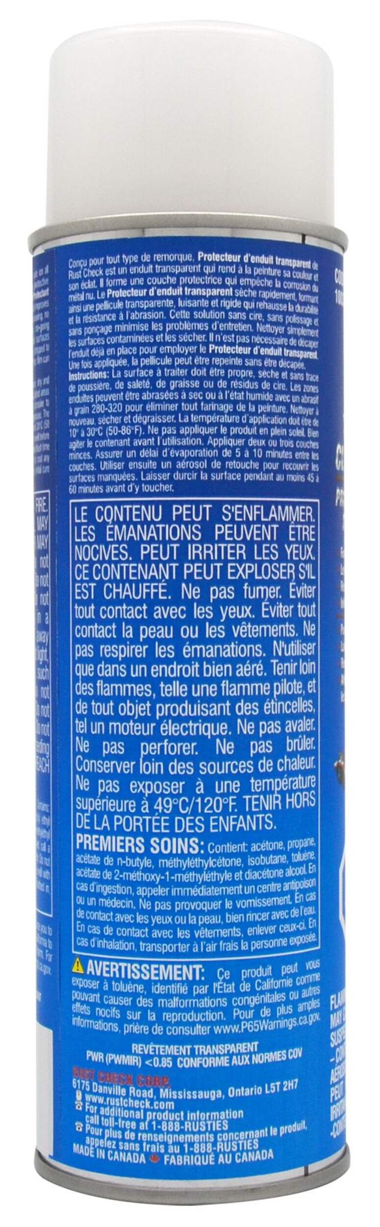Protecteur antirouille Rust Check pour remorque et aluminium laissant un revêtement protecteur transparent sur les surfaces métalliques enduites et non enduites
