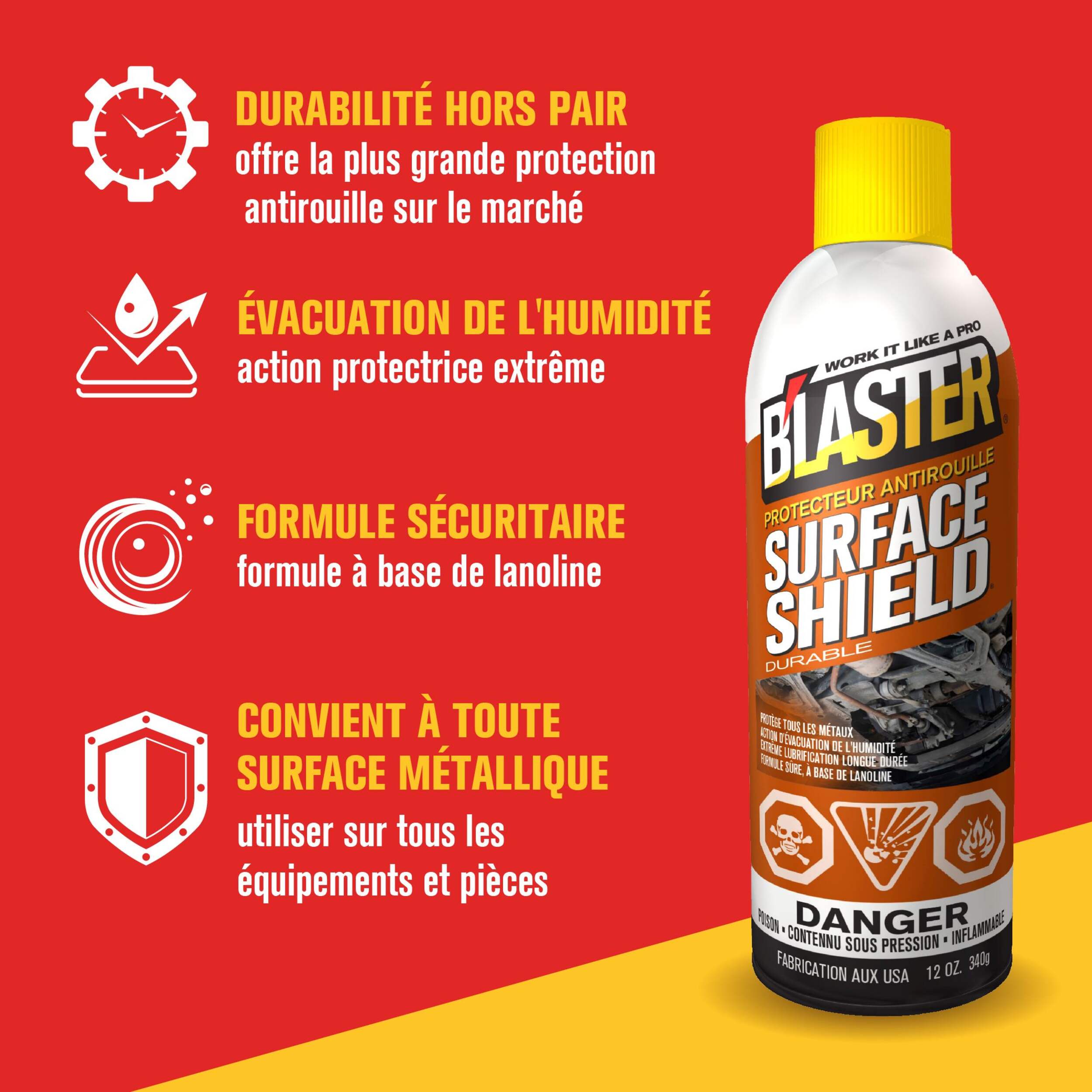 Le protecteur B'laster Surface ShieldMD est l'antirouille le plus durable sur le marché. Cette formule unique est facile à appliquer et offre une protection complète contre la corrosion pour toutes les surfaces métalliques, l'équipement et les pièces mobiles. Il s'agit de la meilleure défense contre la rouille.
