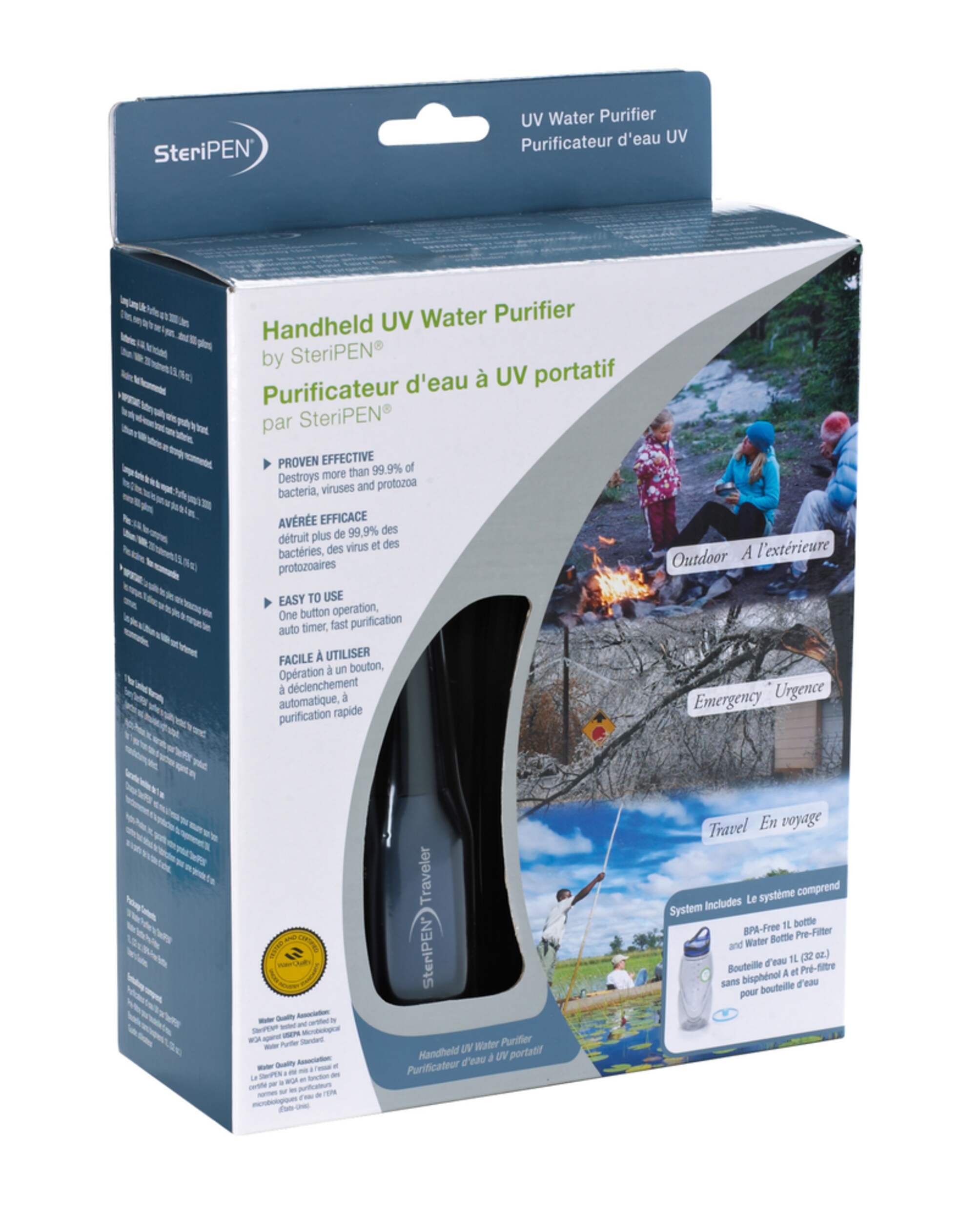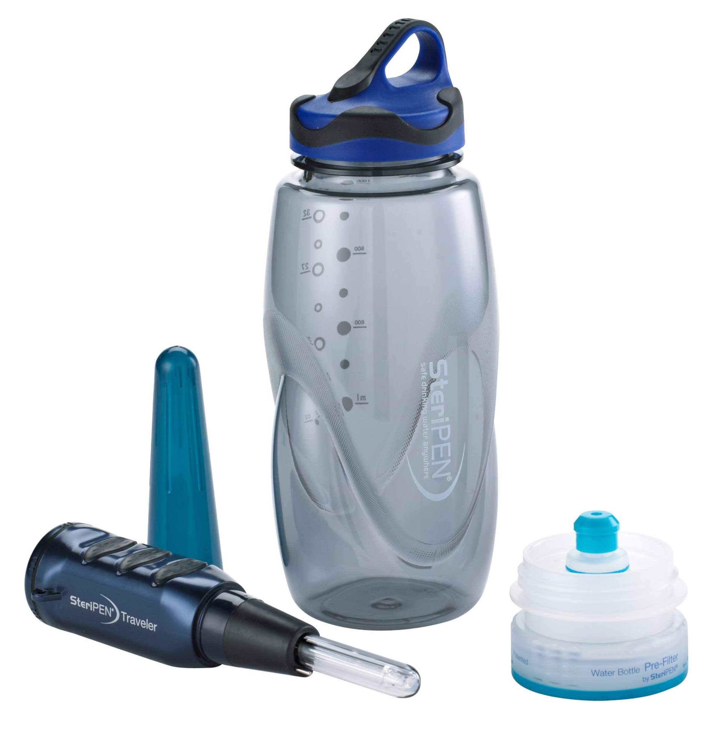 Purificateur d'eau UV à main comprend un purificateur d'eau UV SteriPEN, une bouteille de 1 L sans BPA et un préfiltre SteriPEN pour retirer les particules SteriPEN