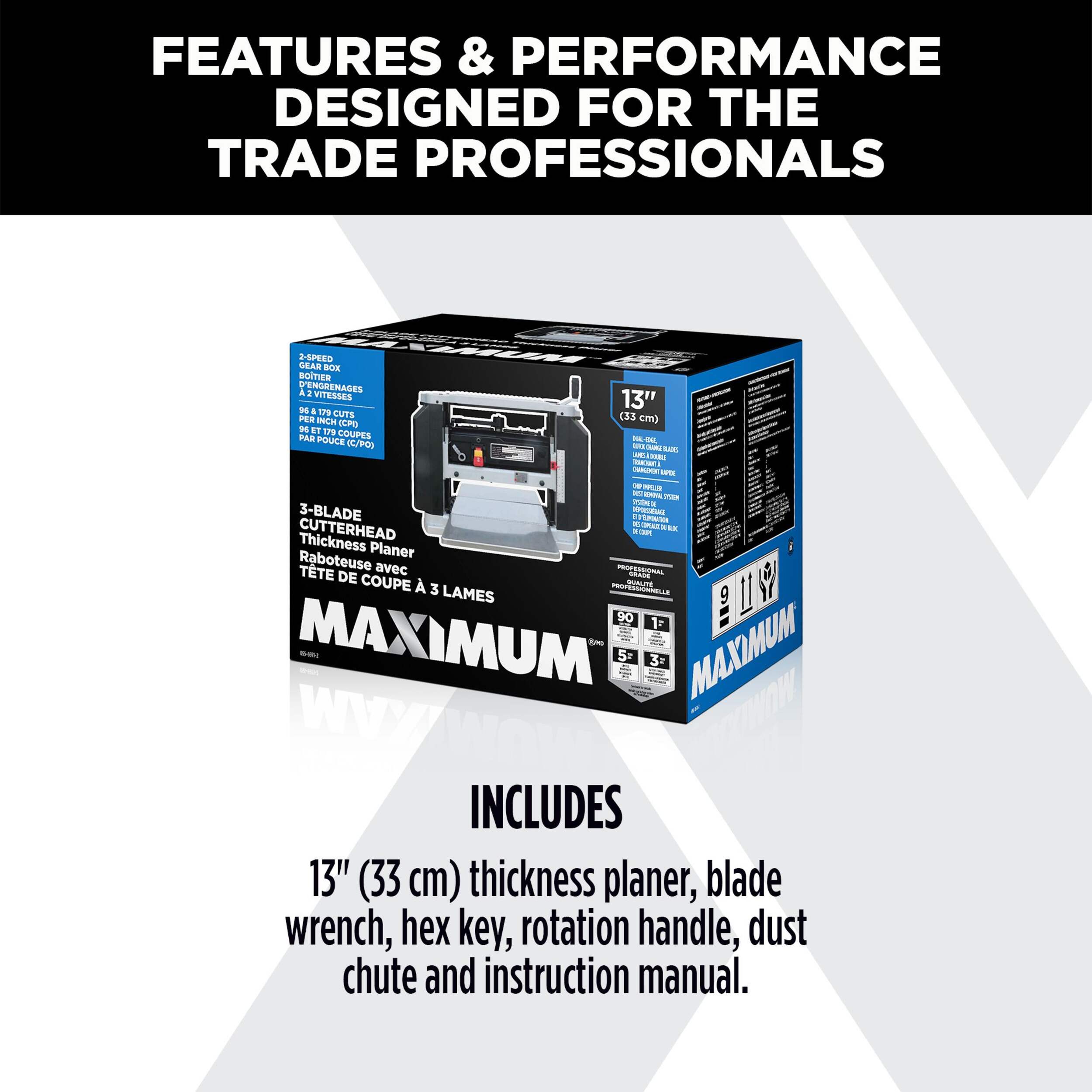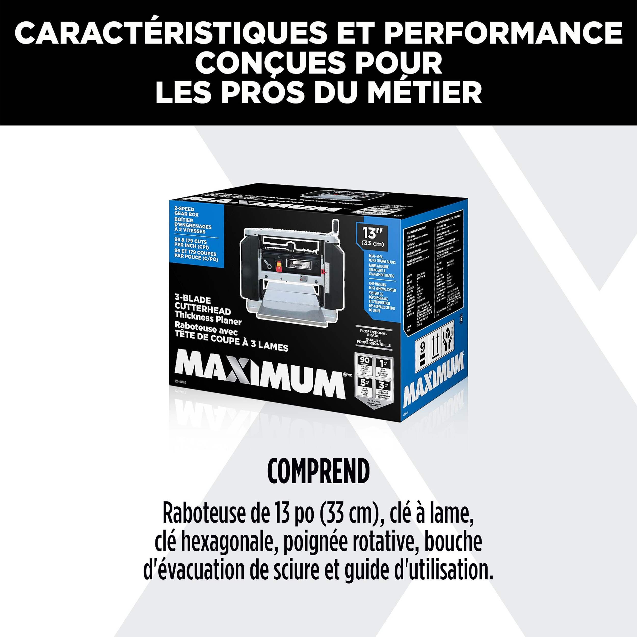 Pour des coupes précises à chaque passage, la raboteuse MAXIMUM peut répondre à vos besoins. Ce couteau à 3 lames qui lisse le bois, laissant une surface sans imperfections avant une finition finale. Plus le travail est important, plus vite vous apprécierez cette puissante raboteuse MAXIMUM.