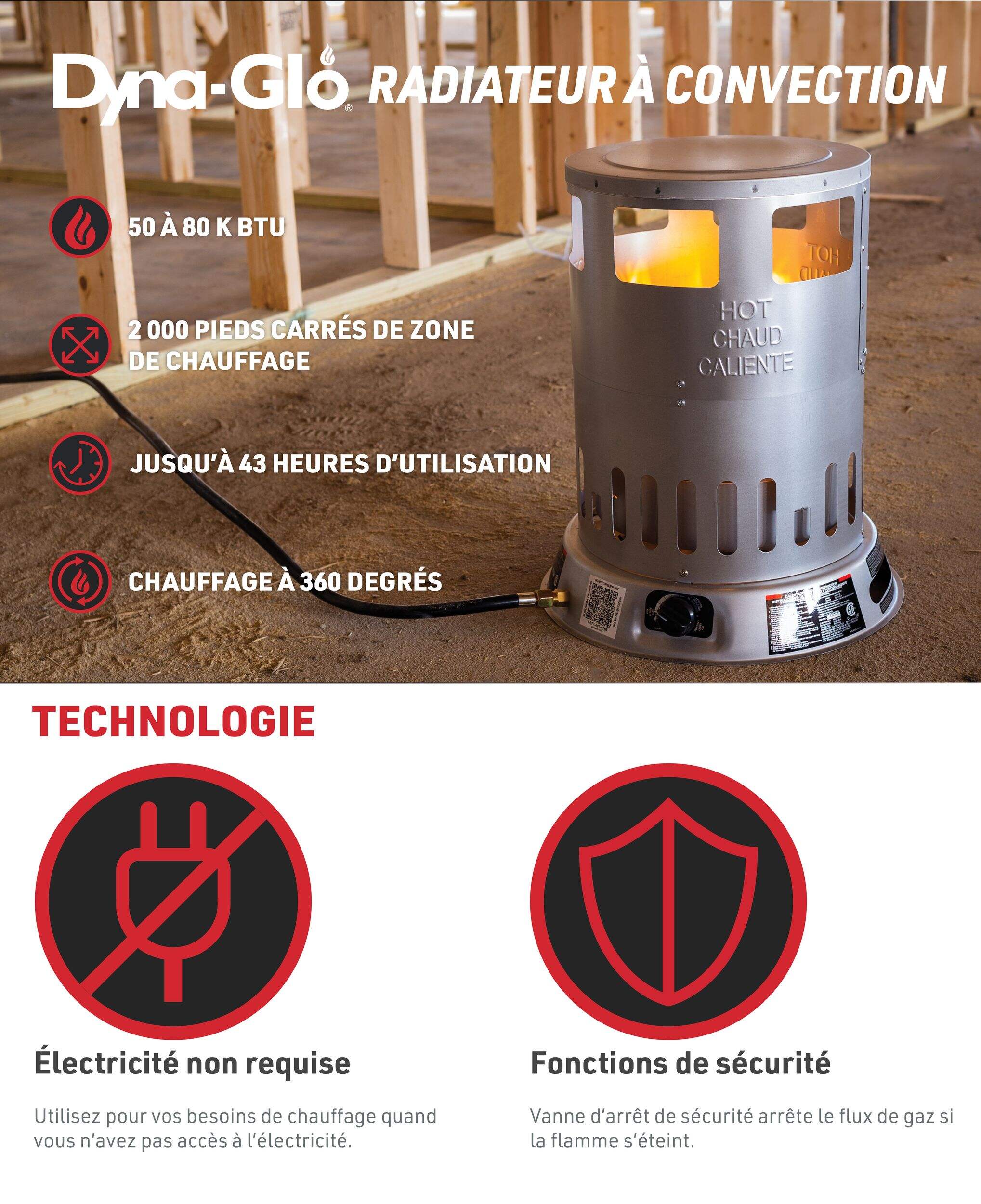 Le radiateur à convection Dyna-Glo offre une chaleur fiable partout où vous en avez besoin, ce qui le rend idéal pour les chantiers extérieurs ou les grands espaces intérieurs. Ses réglages de chaleur variables offrent de la flexibilité pour diverses conditions, tandis que l'arrêt automatique et la base stable améliorent son fonctionnement sécuritaire. Un pare-brise interne dirige efficacement la chaleur. Avec le tuyau et le régulateur inclus, l'installation est facile : il suffit de le brancher à une bouteille de propane et de l'allumer avec l'allumage piézoélectrique. Aucune électricité n'est nécessaire.