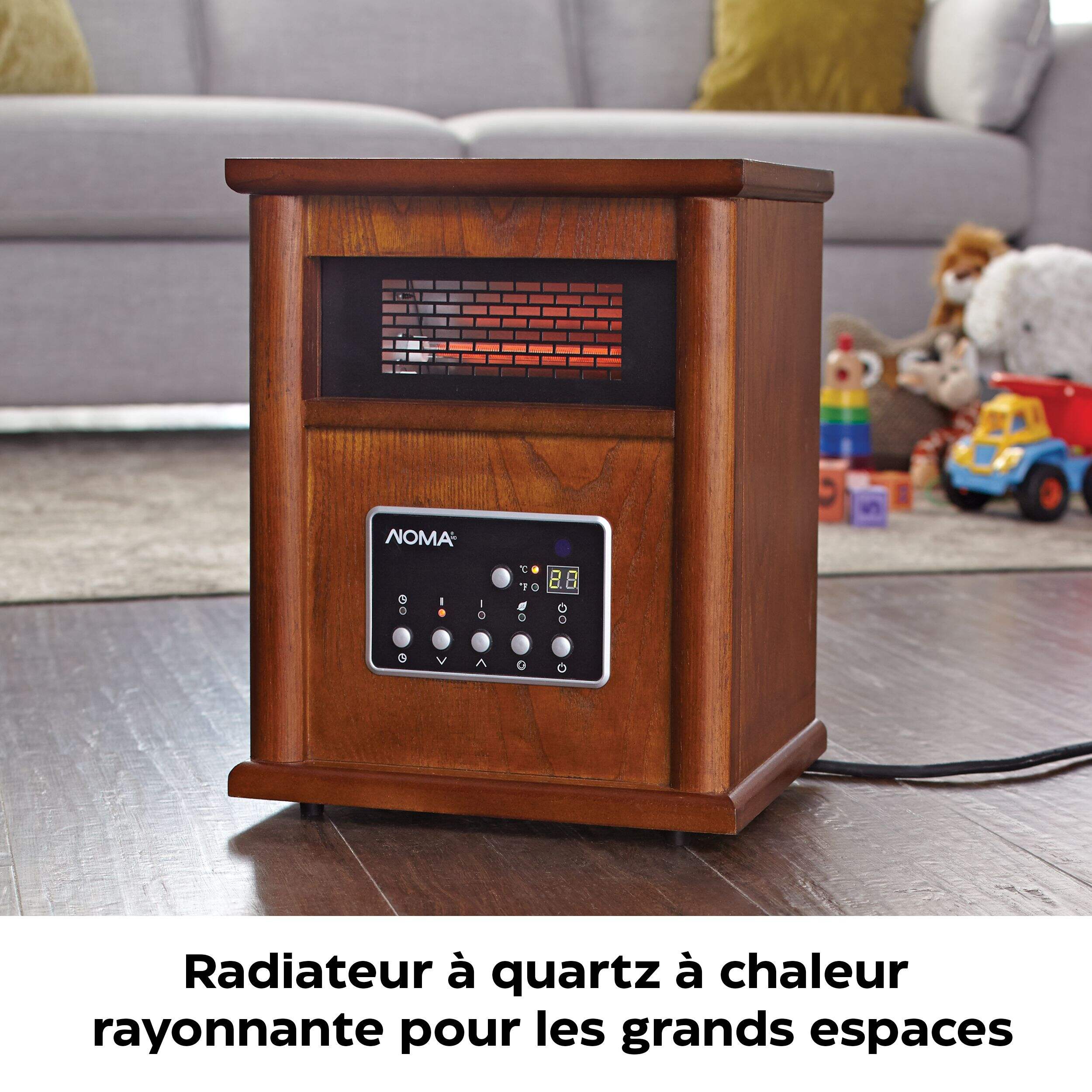 Le radiateur à infrarouges NOMA pour meuble en bois convient parfaitement à toute pièce nécessitant de la chaleur et une touche de style. Ce radiateur est doté de quatre tubes à quartz infrarouges, qui sont très efficaces pour transférer la chaleur. Grâce à son thermostat réglable et à son afficheur à DEL, ce radiateur vous permet de savoir à tout moment quelle est la température actuelle et quels réglages sont en cours.