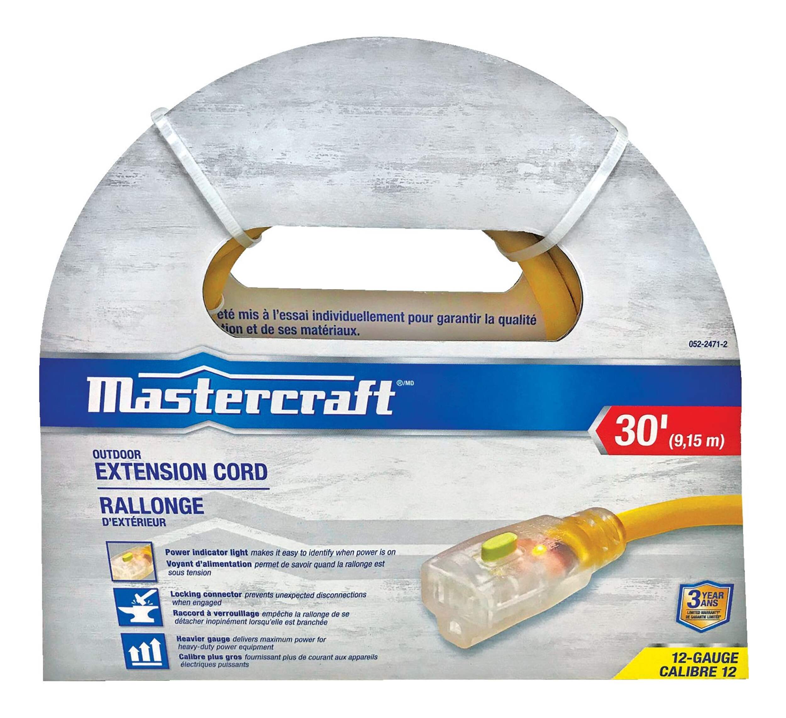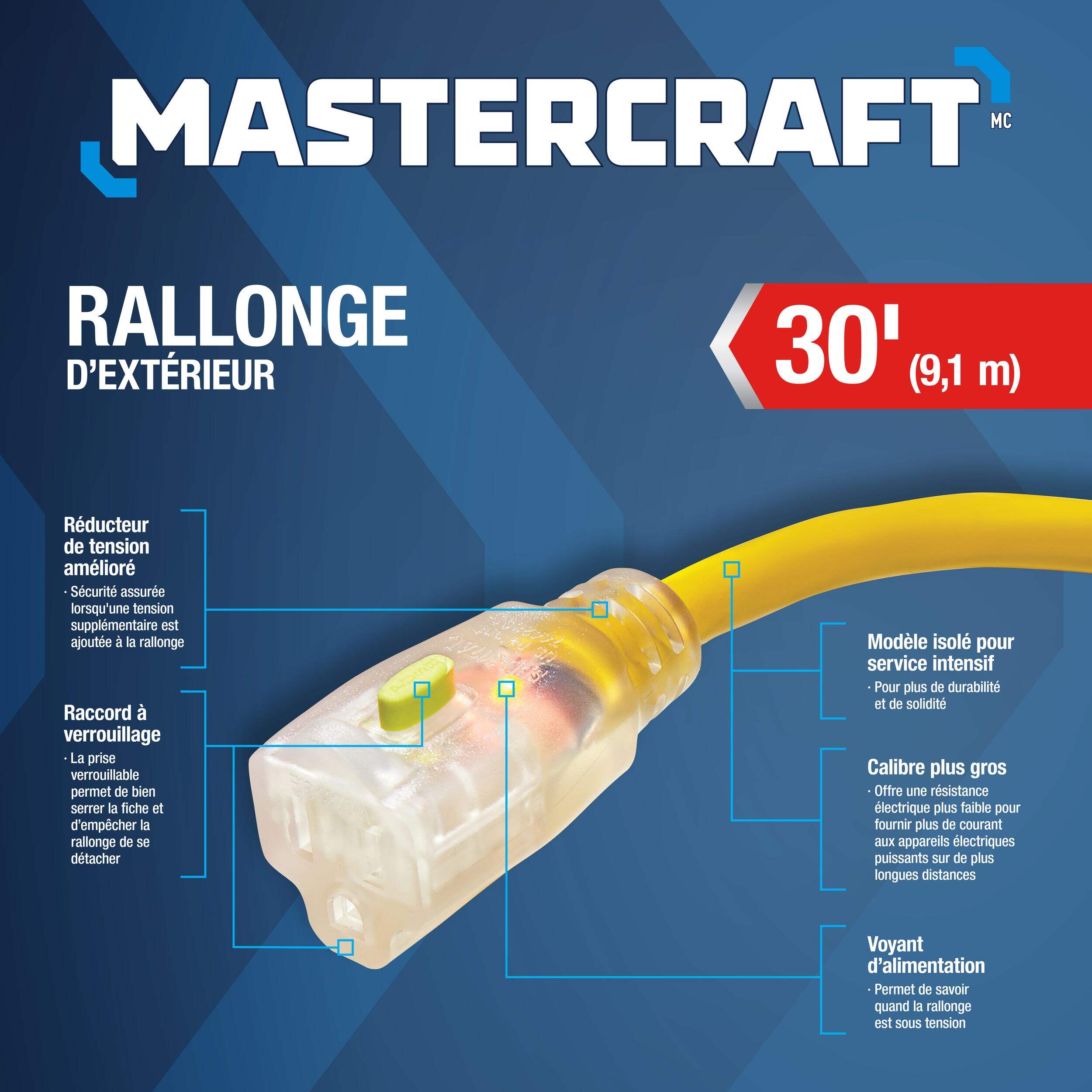 La rallonge d'extérieur Mastercraft de calibre 12 est dotée d'une seule fiche Stanley transparente qui offre une prise maximale lorsque vous travaillez sur des projets difficiles. Non seulement pour assurer votre sécurité personnelle, mais aussi une connexion sécurisée à vos outils électriques, cette rallonge Mastercraft est dotée d'un embout illuminé pour vous informer lorsque l'alimentation est entièrement branchée. Le calibre robuste du câble d'alimentation lui permet de fournir plus de puissance à vos outils, et sa longueur peut accueillir des projets qui vous éloignent des prises pratiques.