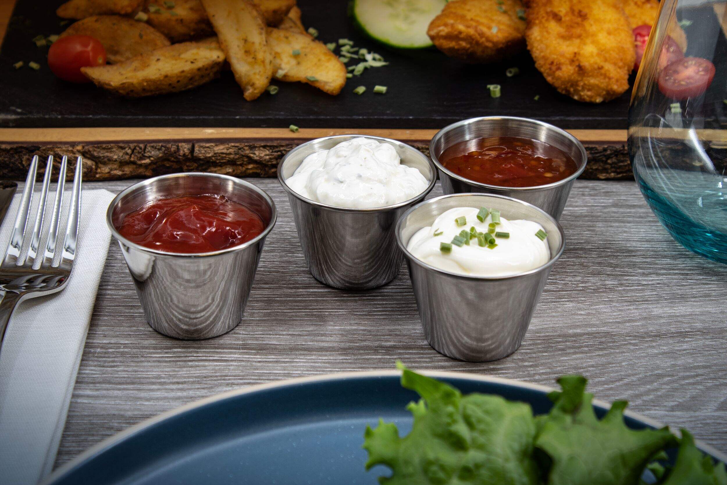 L'ensemble de tasses à sauce MASTER chef en acier inoxydable, 4 pièces, offre une façon élégante de servir des sauces, des trempettes et des condiments. Chaque tasse en acier inoxydable durable peut contenir des 2,5 oz et est dotée d'une forme effilée qui s'empile facilement pour un rangement compact. Avec leurs bords arrondis pour plus de solidité, ces tasses à sauce ajoutent une touche d'élégance à n'importe quelle table tandis que leur fini miroir permet aux sauces de briller. En acier inoxydable de haute qualité, ces ramequins résistent à une utilisation quotidienne sans se déformer. Leur format compact les rend parfaits pour des portions individuelles de sauce ou de garnitures. Un incontournable pour les réceptions, ces ramequins compacts simplifient le service tout en ajoutant une touche d'élégance.