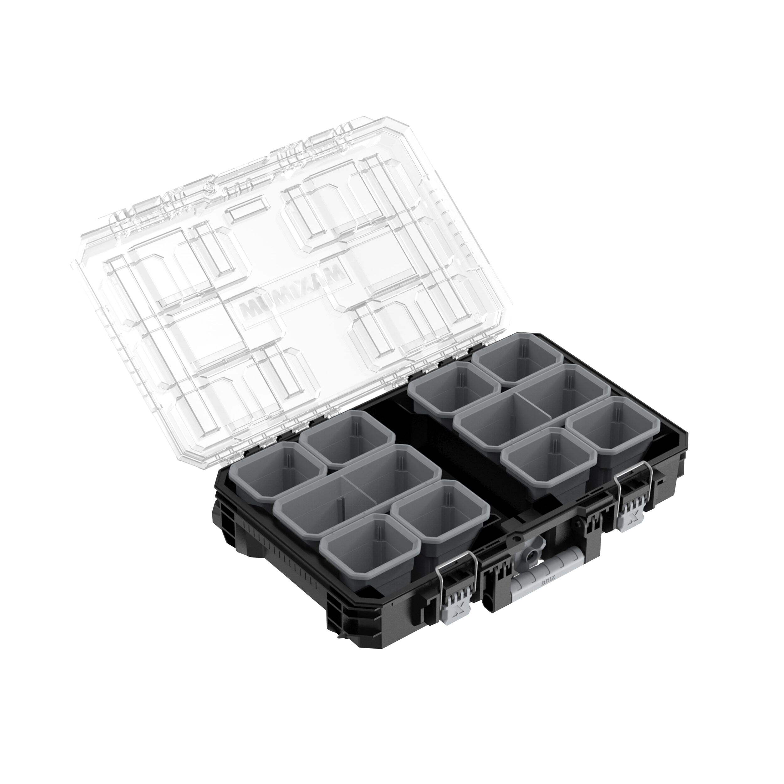 Plateforme Maximum BRIX complète : 058-1860 (ensemble à roulettes de 3 pièces), 058-1861 (boîte supérieure), 058-1862 (boîte centrale), 058-0083 (range-pièces demi-taille), 058-0084 (range-pièces complet) et 058-0085 (ensemble d'accessoires externes), 058-0086 (sac à outils à parois souples), 058-0087 (crochets externes, paq. 2) et 058-0088 (chariot)