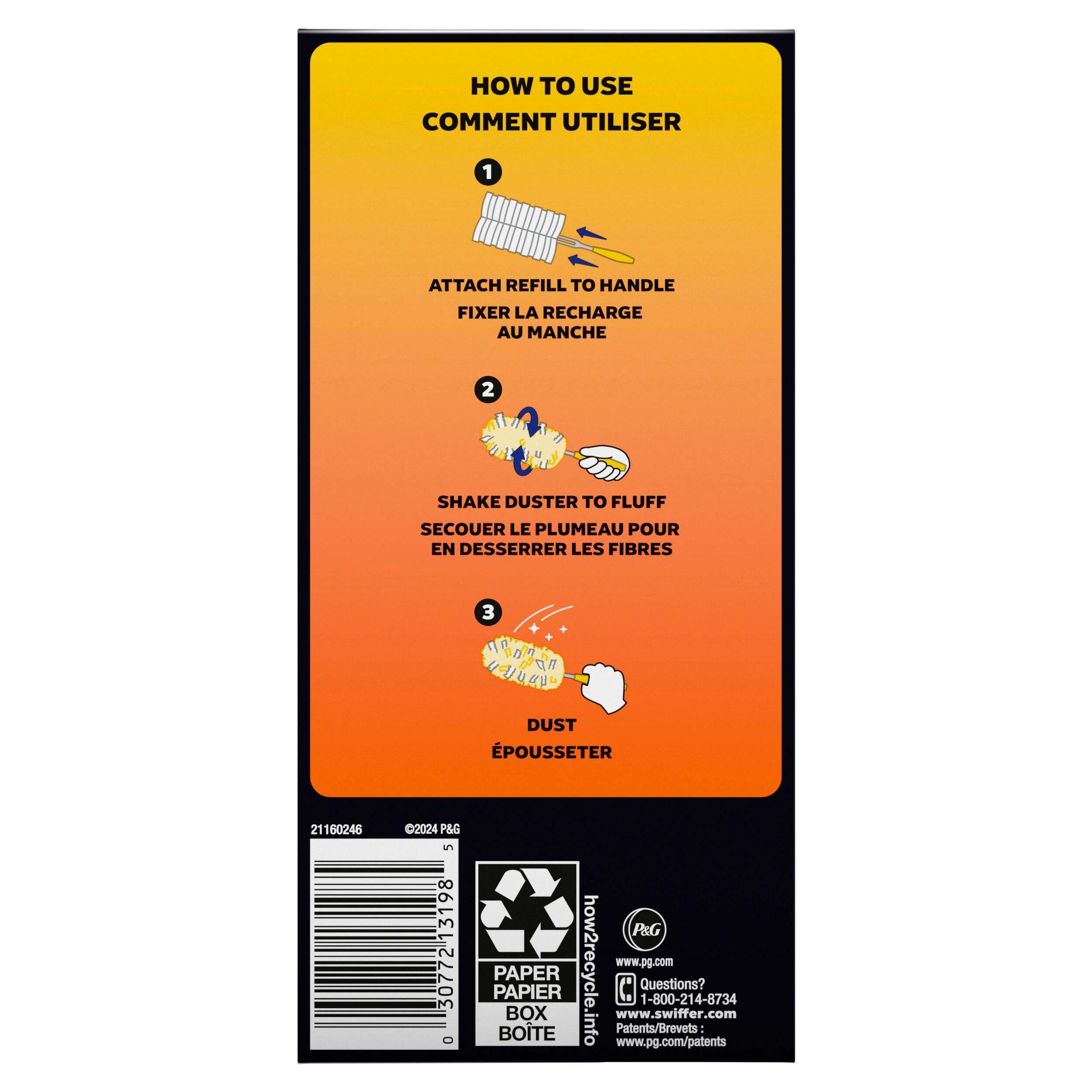 Plumeau Swiffer Heavy Duty Dusters emprisonnant jusqu'à 98 % des allergènes des chiens et chats*. Avec des milliers de fibres duveteuses à revêtement spécial et un design à 360°, les plumeaux Swiffer Dusters se capturent la poussière dans toutes les directions et ne la laissent pas s'échapper. *Allergènes inanimés courants des squames de chat et de chien et de la matière d'acariens