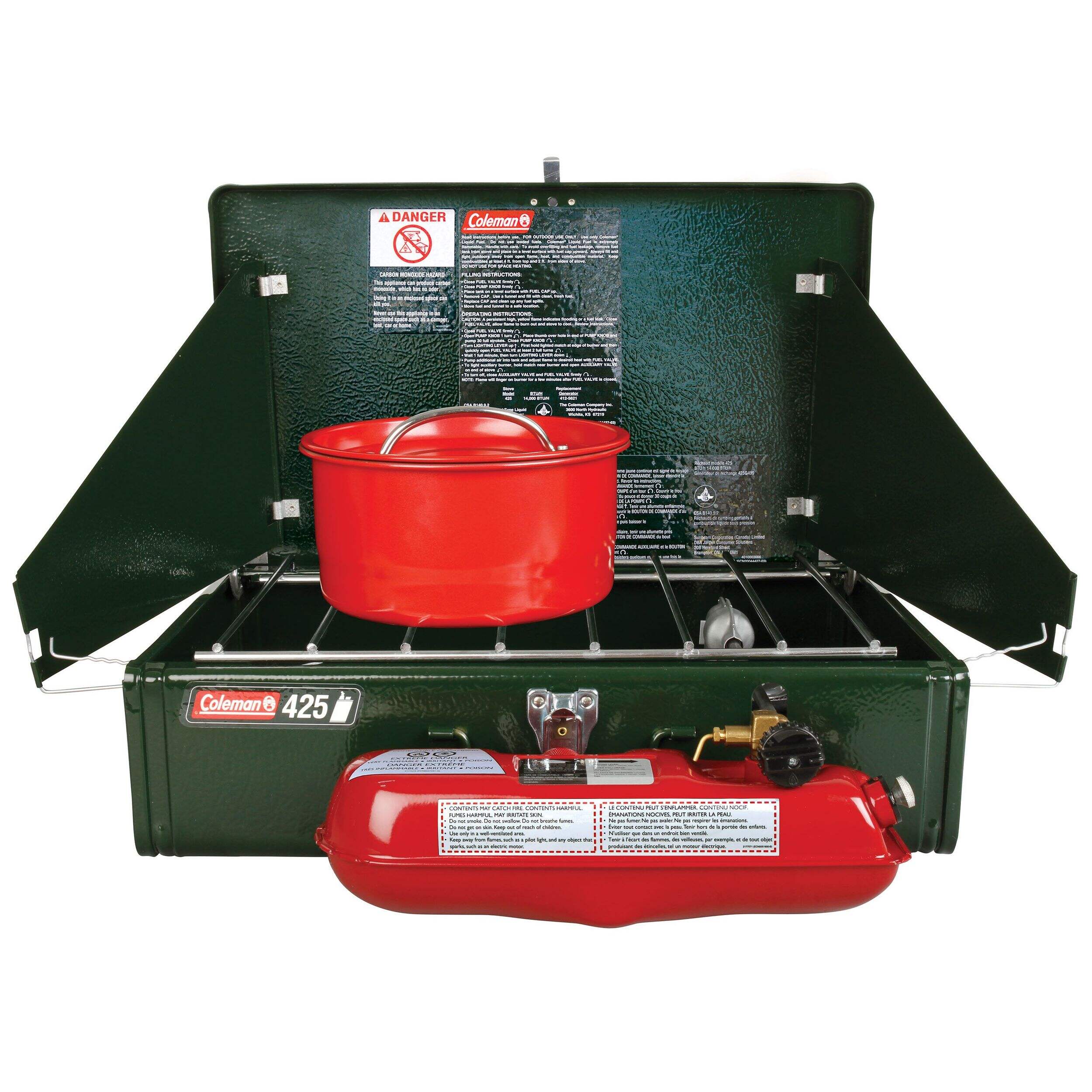 Cuisinez le déjeuner, le dîner et le souper en tout temps sur le réchaud à combustible liquide Coleman série Guide. Surface de cuisson qui peut accueillir 2 poêles de 25 cm (10 po) en même temps au-dessus de 2 brûleurs Band-a-Blu qui offrent une puissance de cuisson totale de 14 000 BTU. Lorsque vous utilisez le combustible liquide Coleman, vous pouvez emporter moins de carburant avec vous pour économiser de l'argent et économiser de l'espace de rangement. Panneaux WindBlock qui protègent la flamme du vent et peuvent être ajustés pour convenir à différentes tailles de poêles. Lorsque le repas est terminé, la grille chromée se retire pour un nettoyage simple et rapide.